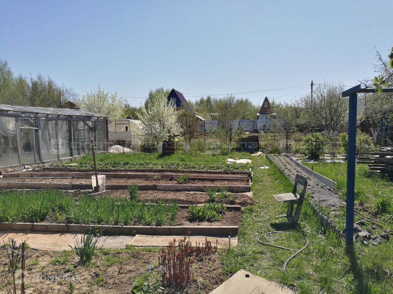 Справа и на дальней стороне участка растут многолетние, плодоносящие деревья.
