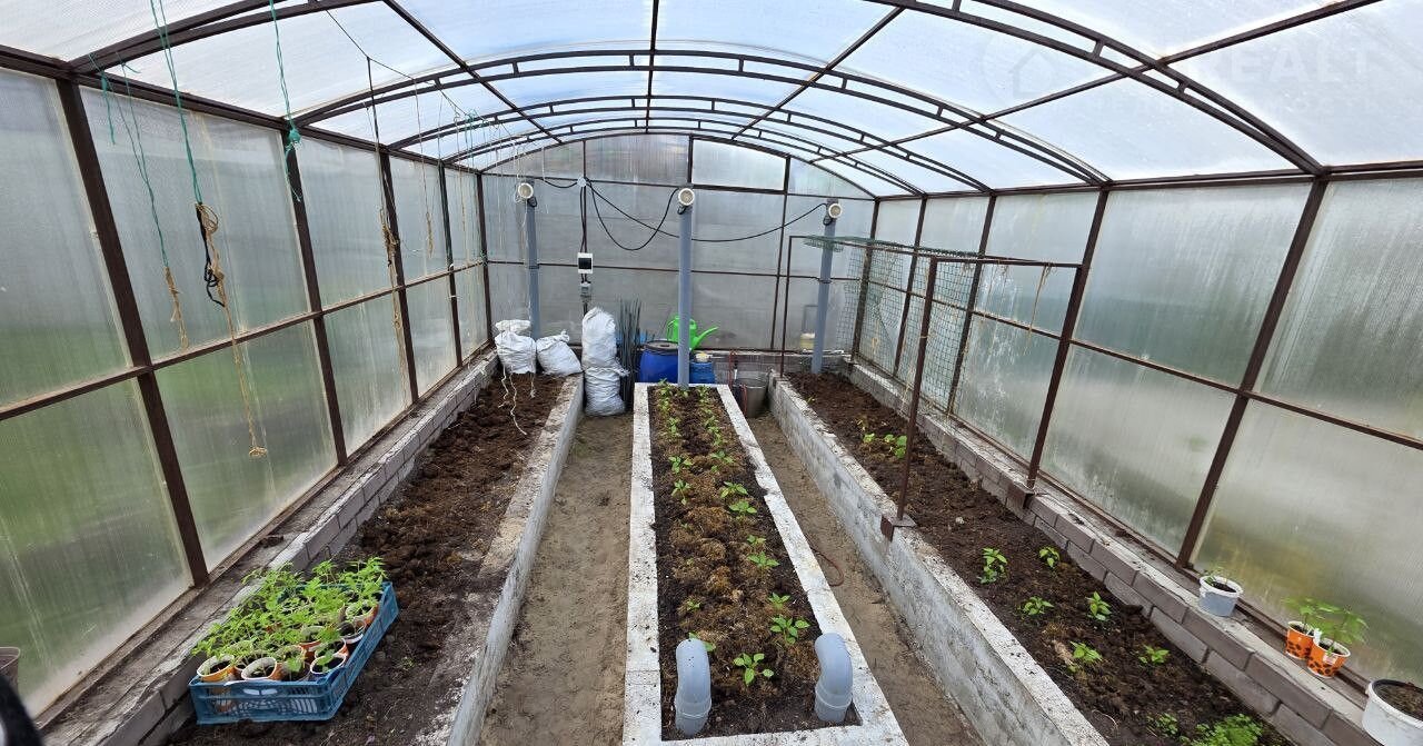 + На участке: теплица, много насаждений, плодовых и ягодных культур, сосны.