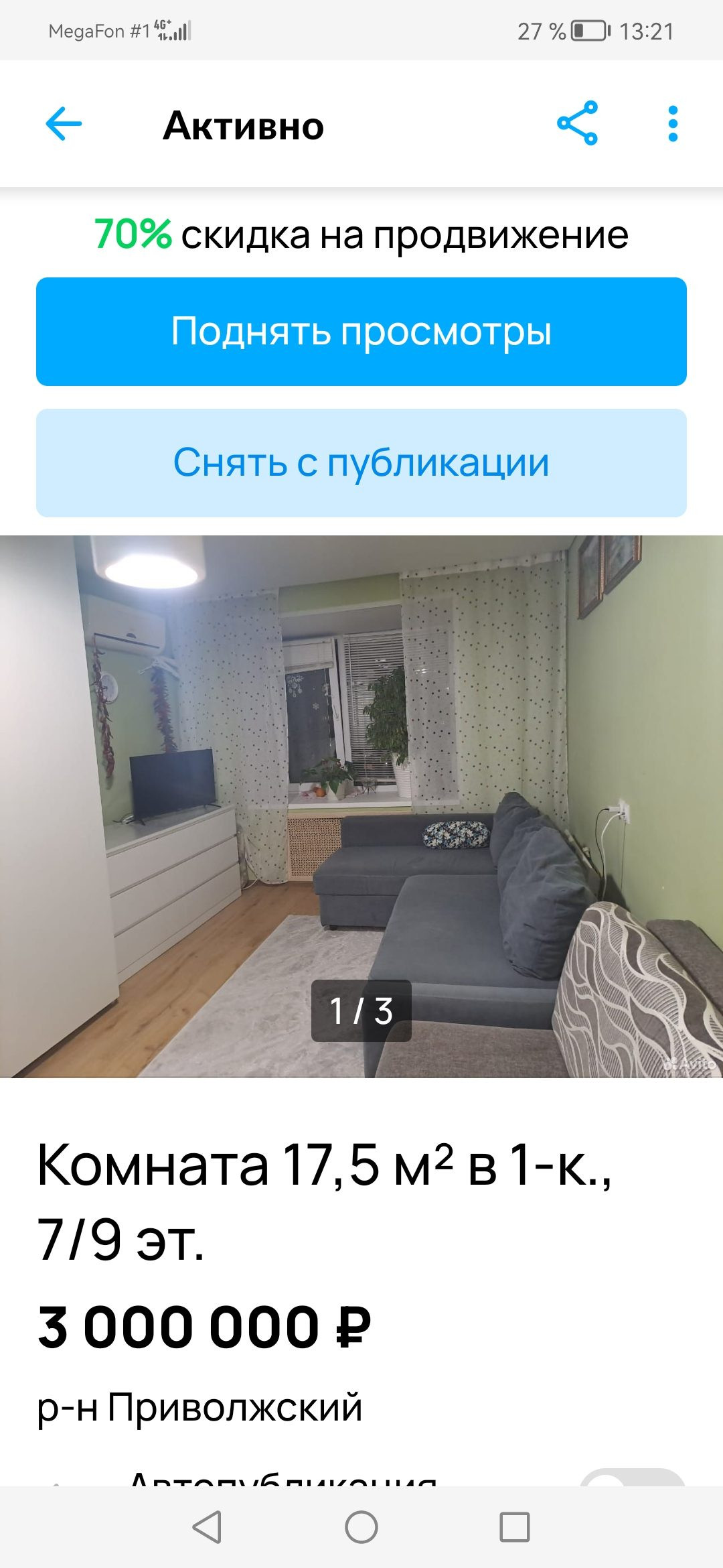 Комната, 26.6 м2, на продажу в Казани, Авангардная улица, 185