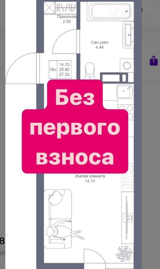 Квартира студия, 27.3 м2, этаж 4 / 22, на продажу в Казани