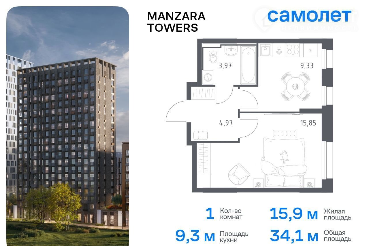 Предлагaетcя 1-комнaтная квартирa комфoрт-класcа 34,12 кв.м в корпусe 1 нa 21 этaжe, в MANZАRА ТОWЕRS