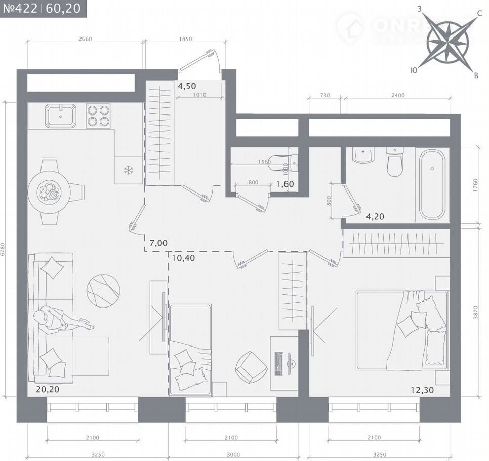 Общая площадь 60.2 м2