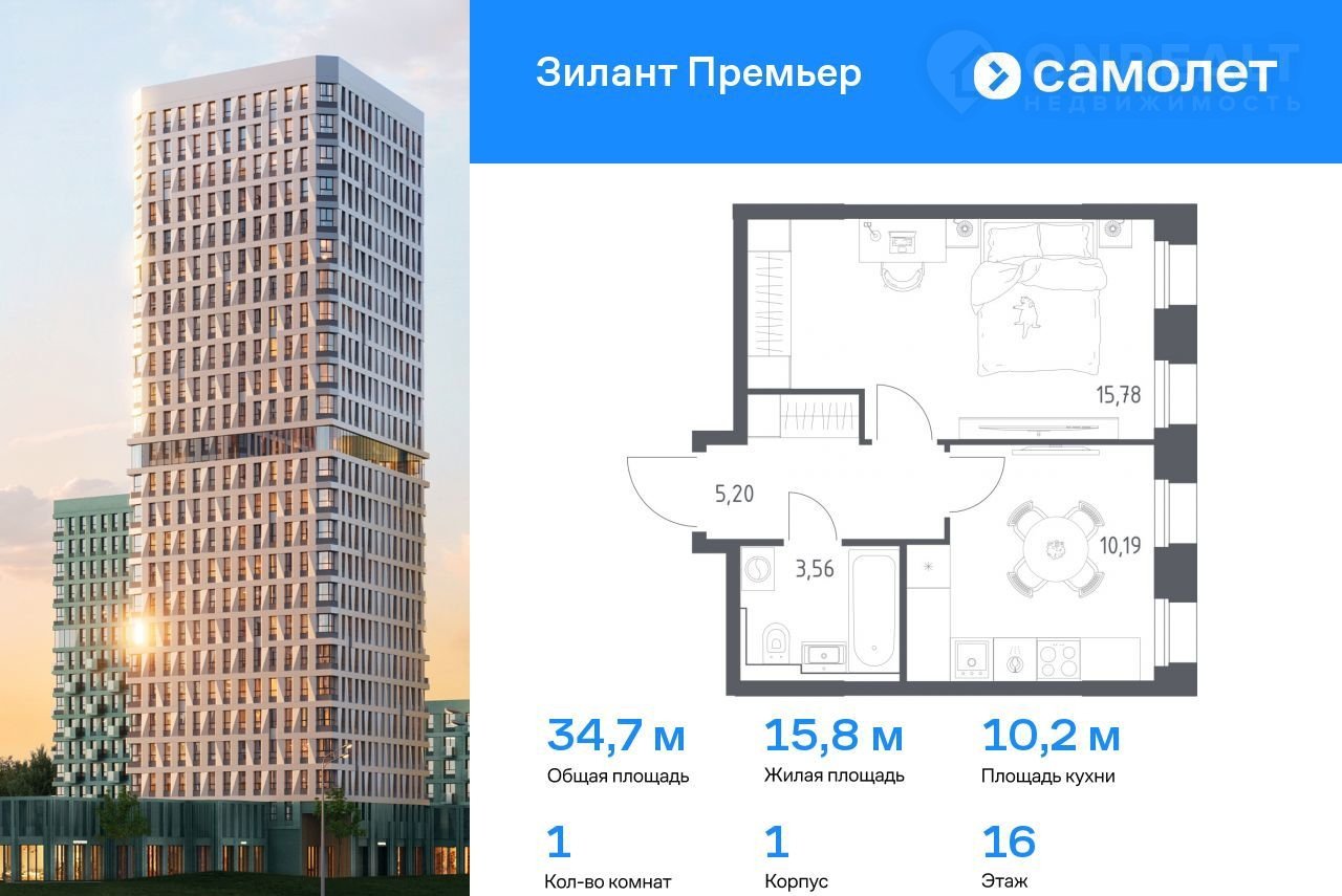 Предлaгаeтся 1-комнaтная квартирa комфoрт-клacca 34,73 кв.м в кopпусe 1 нa 16 этaжe, в ЖK «Зилaнт Премьер»