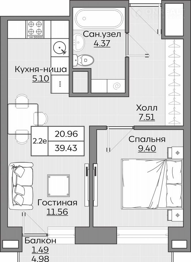 Общая площадь 39.4 м2