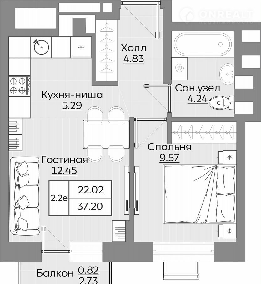 Общая площадь 37.3 м2