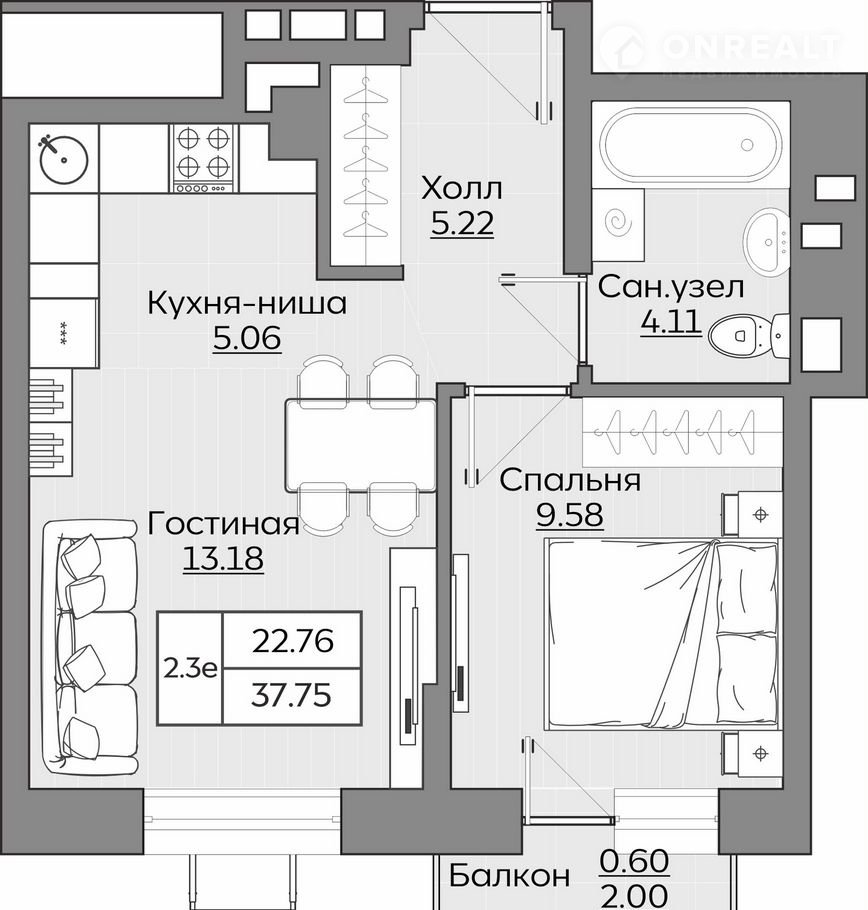 Общая площадь 37.8 м2