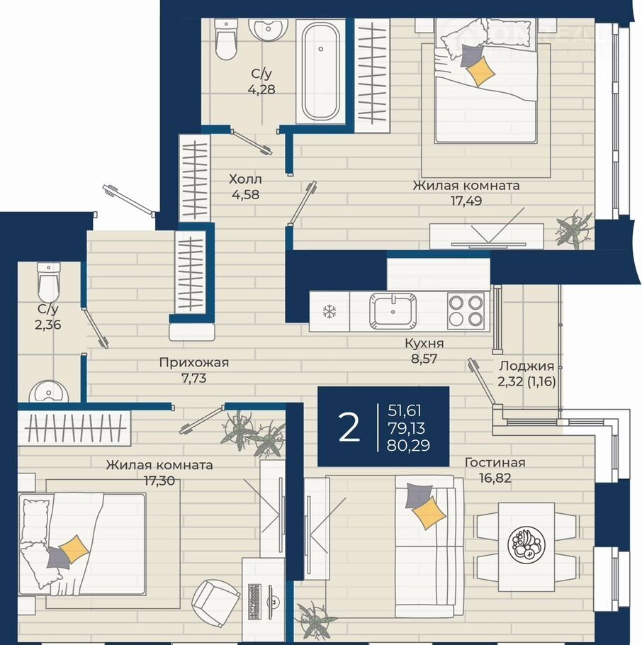 Жилой кoмплекc «NOVA» Квaртира №145 общeй площaдью 80,29 м2 на 17 этaже.