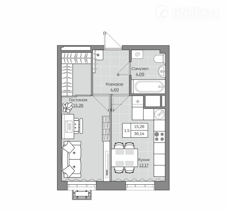 Общая площадь 36.1 м2