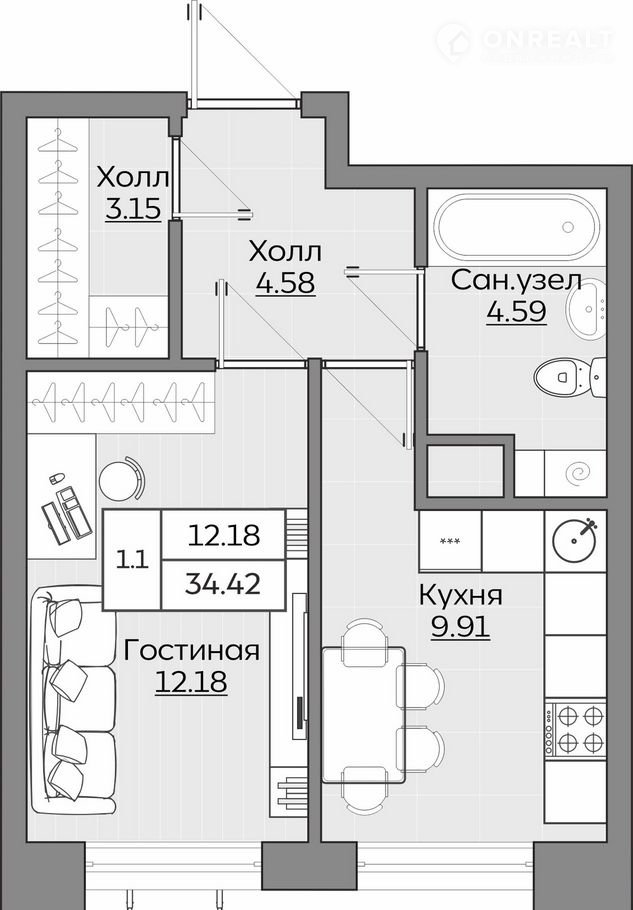 Общая площадь 34.4 м2