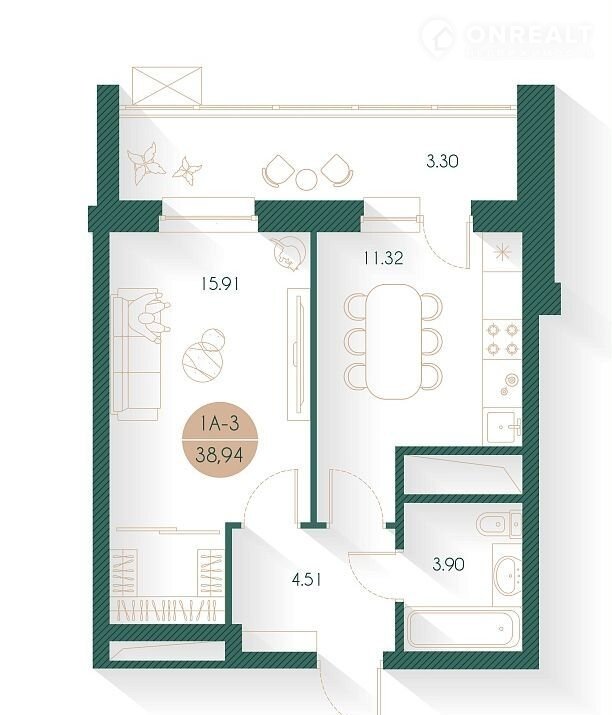 Общая площадь 38.9 м2