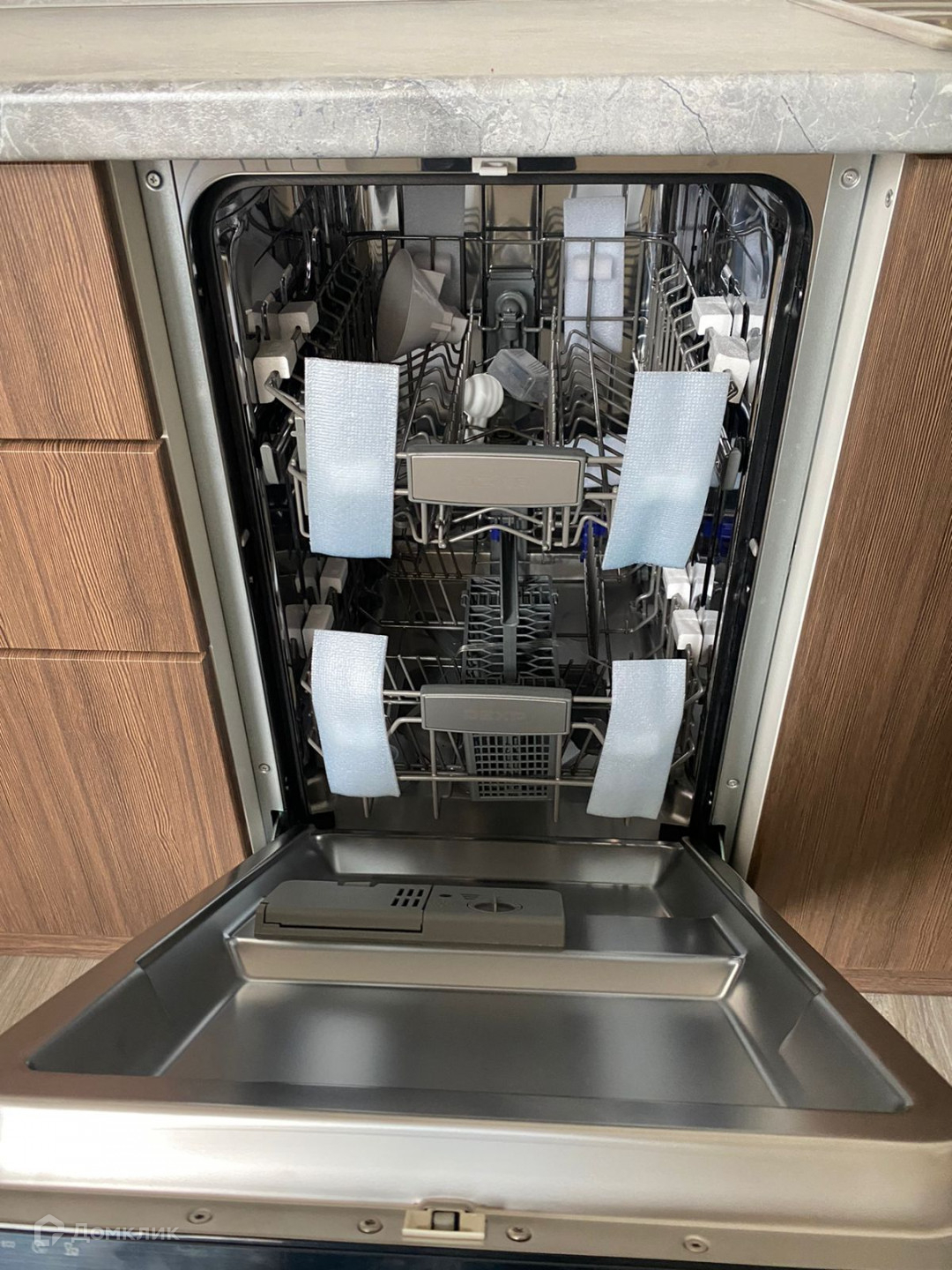 Для Вашего комфорта квартире оборудована современным стильным кухонным гарнитуром со встроенной кухонной техникой (варочная поверхность, духовой шкаф, вытяжка, посудомоечная машина)