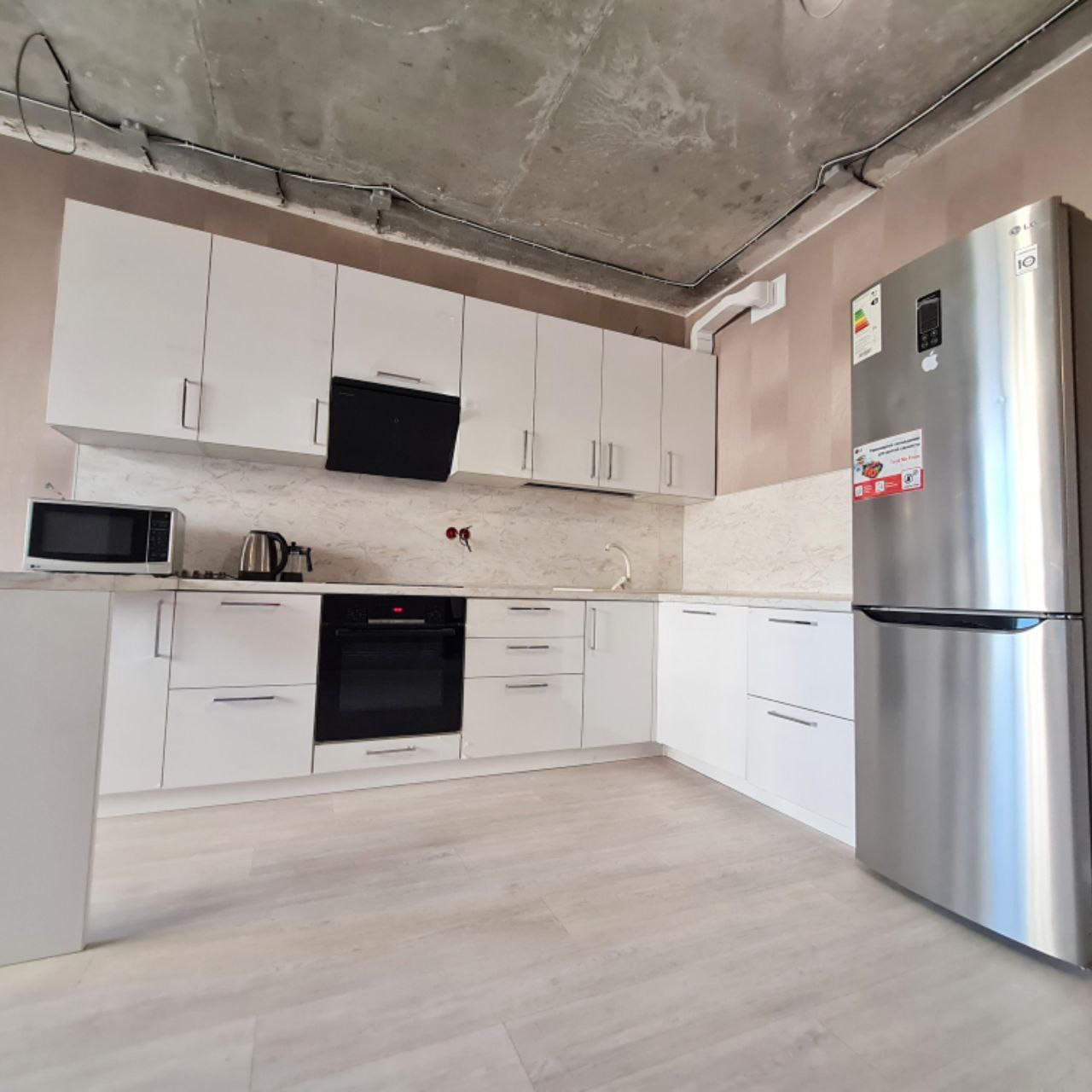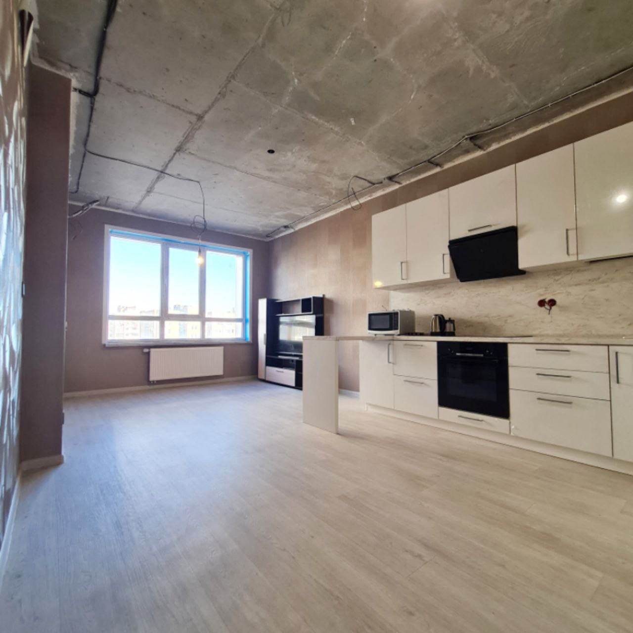 Кухня-гостиная оборудована новым кухонным гарнитуром со встроенной бытовой техникой