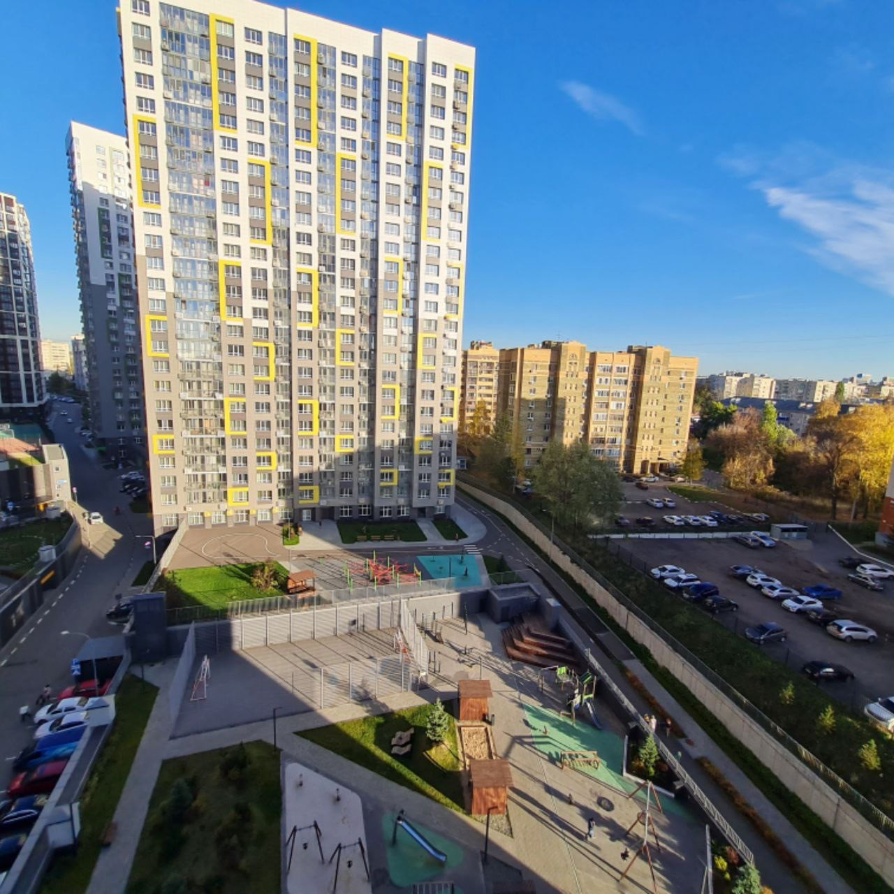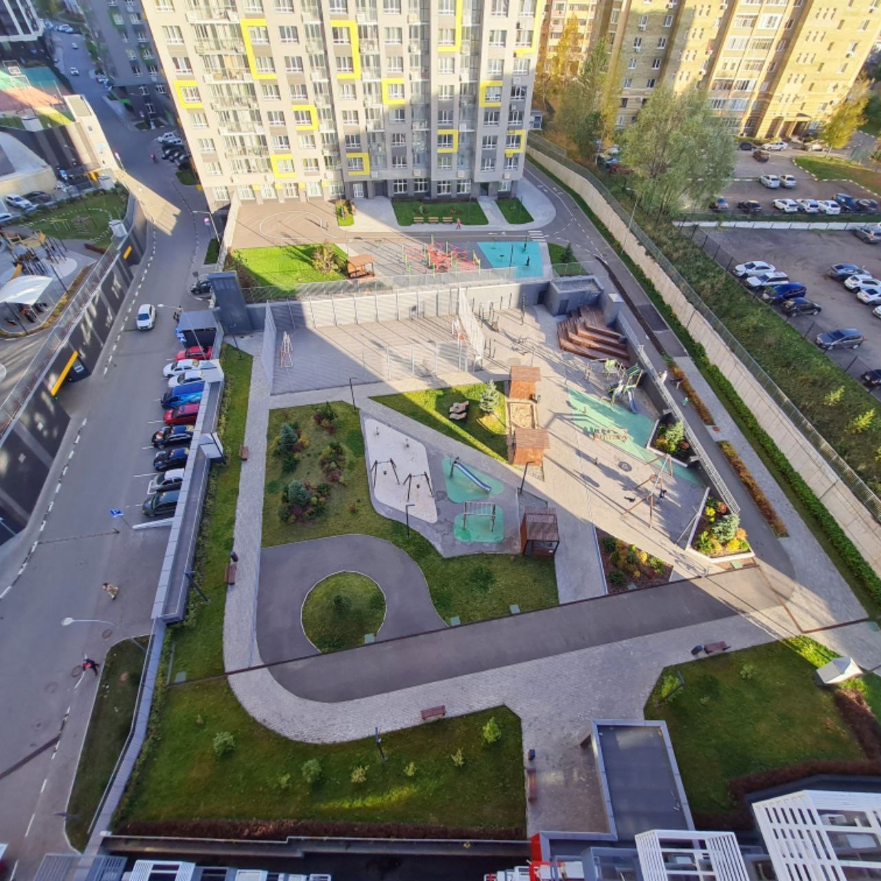 -  двор, оборудованный современной детской площадкой
