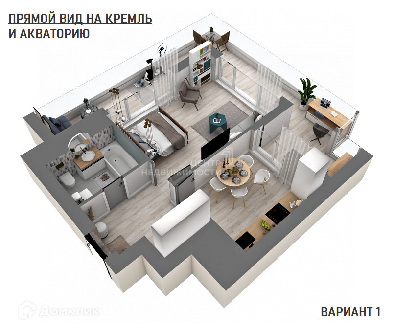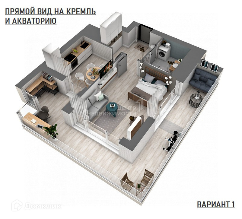 Благодаря удачной планировке, квартиру можно оборудовать отдельной спальной комнатой, рабочим кабинетом, просторной гостиной с кухней, а также установить беговую дорожку с видом на город и реку.