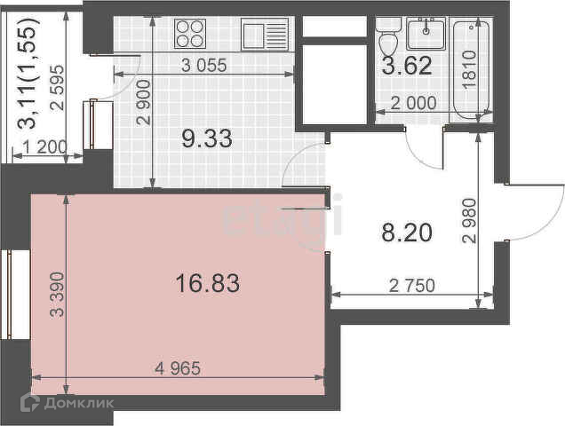 Общая площадь 33.3 м2