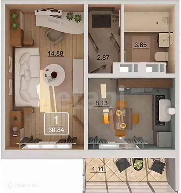 Общая площадь 30,9 кв.м., жилая площадь 14,88 кв.м., площадь кухни 8,1 кв.м., застекленный балкон.