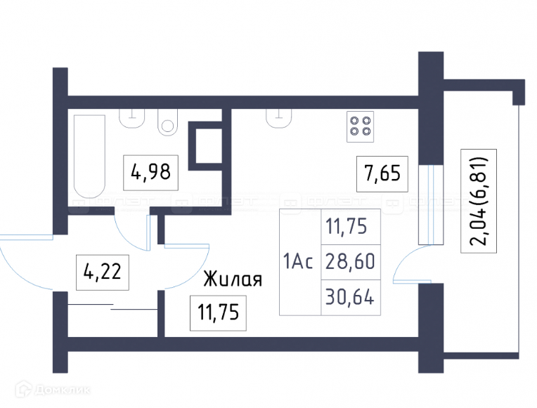 Общая площадь 28.5 м2