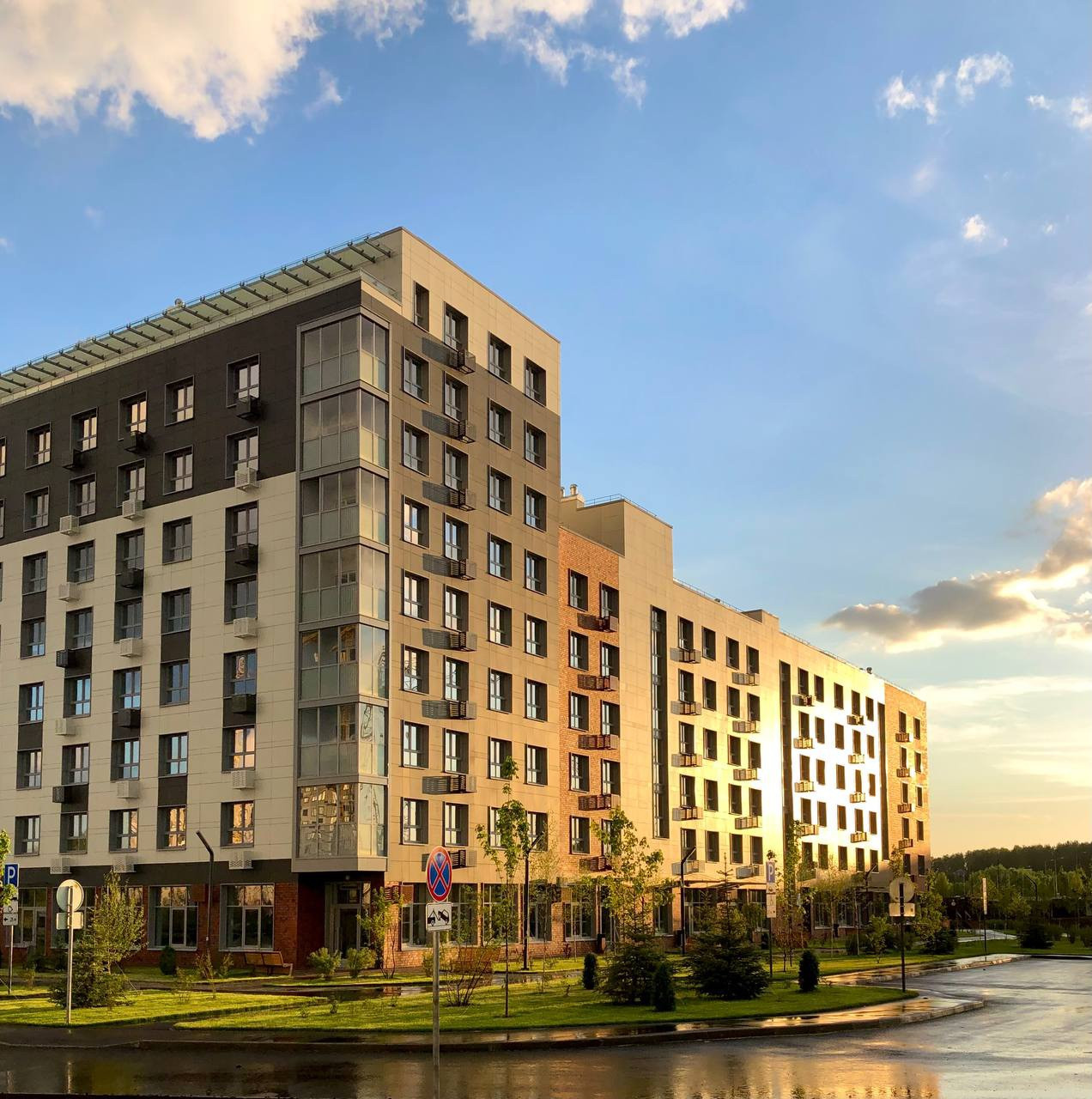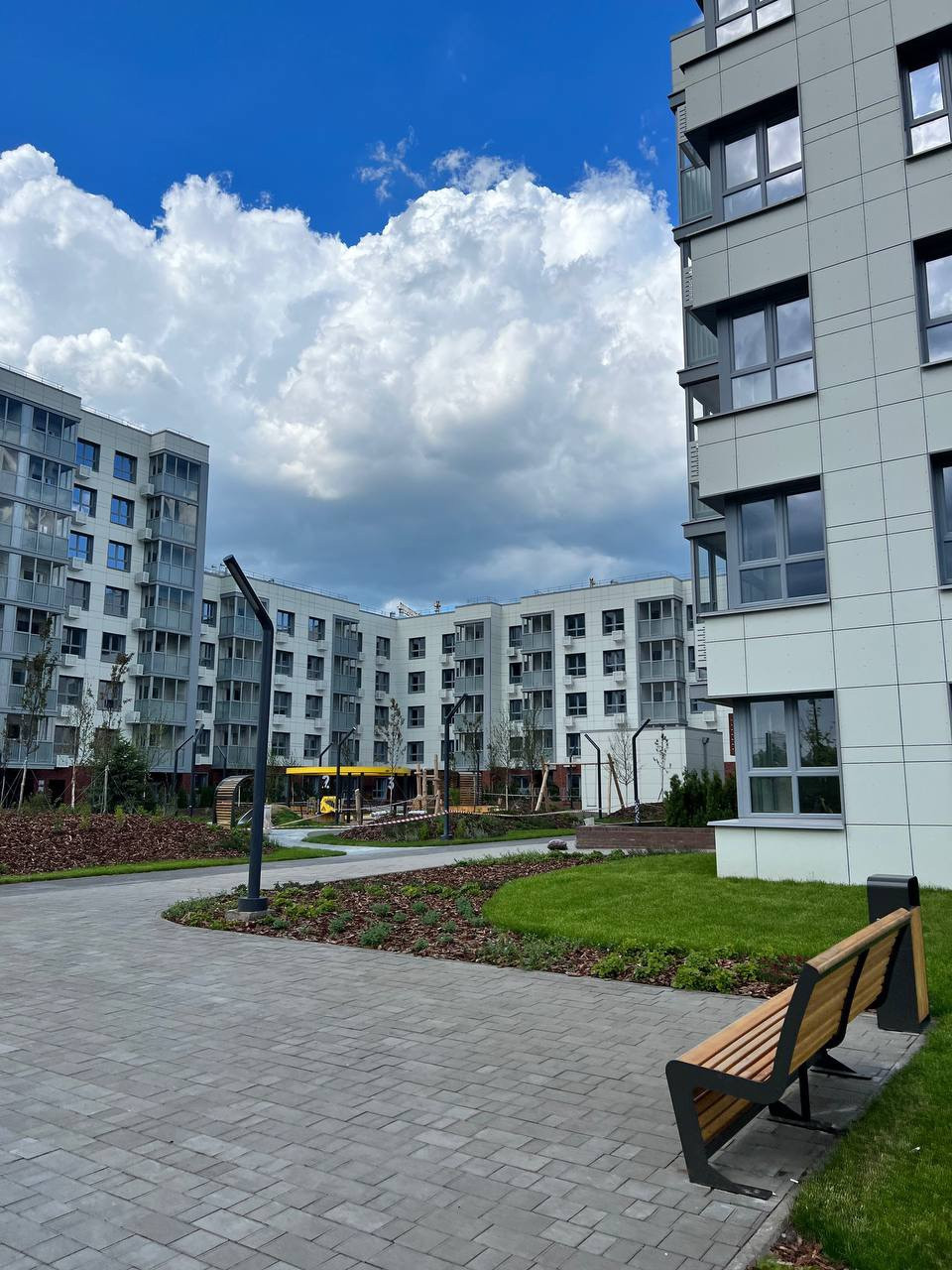 Территория вокруг дома уже благоустроена, в доме закрытый двор без машин с земельными зонами. В комплексе строятся 2 детских сада и школа. Зеленый бульвар и набережная вдоль реки Нокса. В доме есть колясочные, видеонаблюдение, детские и спортивные площадки, велодорожки.