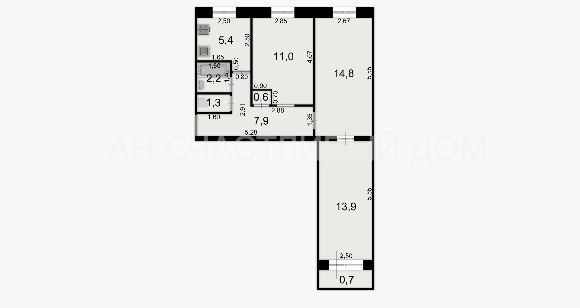 - уютную кухню 5,4 кв.м. можно легко перепланировать в просторную кухню-гостиную, объединив с одной из комнат,