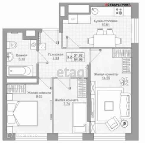 Общая площадь 55 м2