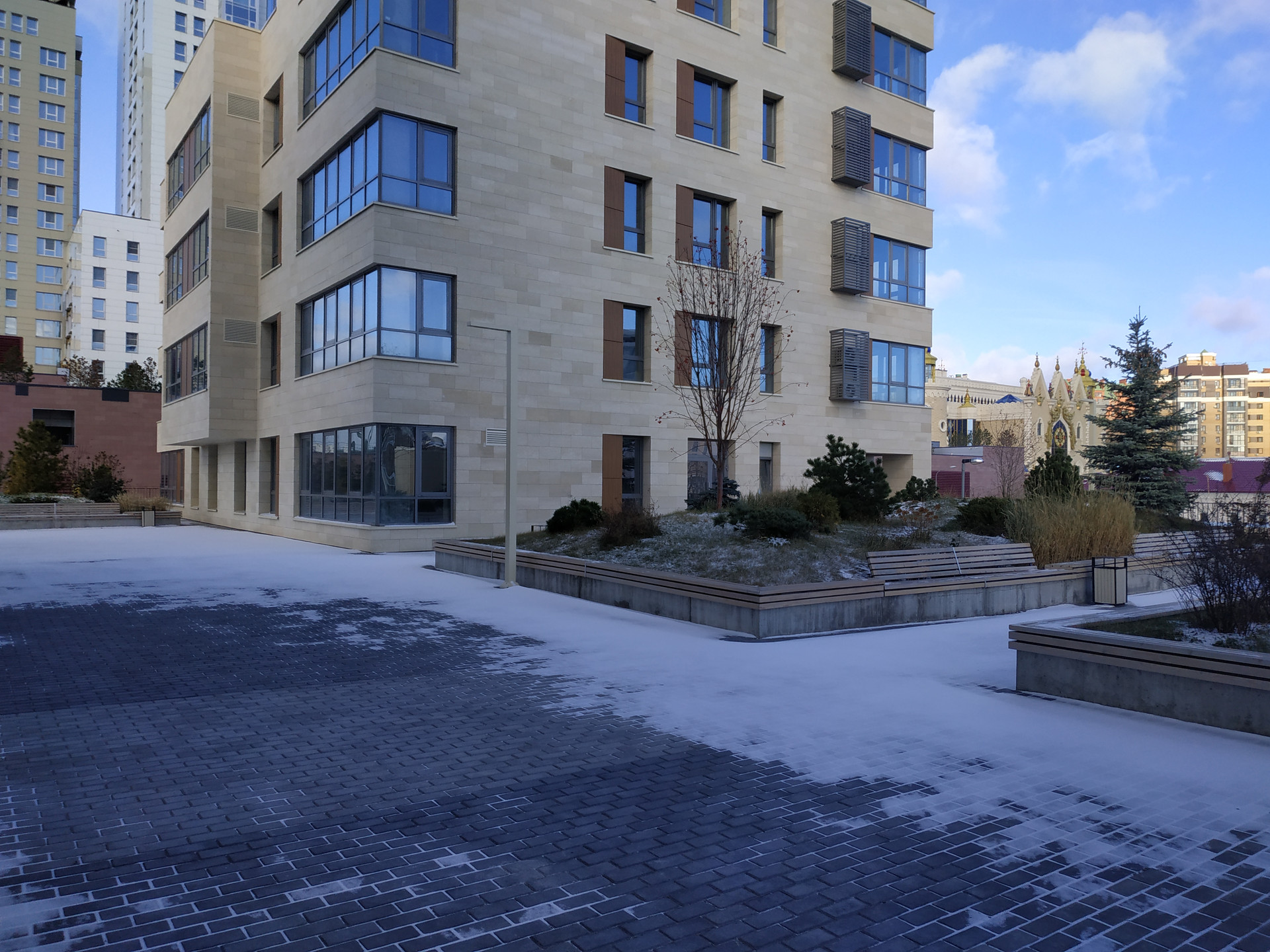 Придомовая территория обустроена по всем нормам и требованиям. Двор является закрытой площадкой с круглосуточным видеонаблюдением. Так же есть детская игровая площадка для детей всех возрастов, спортивная площадка для взрослых, прогулочные аллеи. Для автовладельцев предусмотрен подземный паркинг. Инфраструктура, окружающая новостройку, хорошо развита и современная. Жилой комплекс окружают: детские сады, школы, лицеи, кафе, рестораны, ТЦ Сувар Плаза, кукольный театр Экият и многое другое.