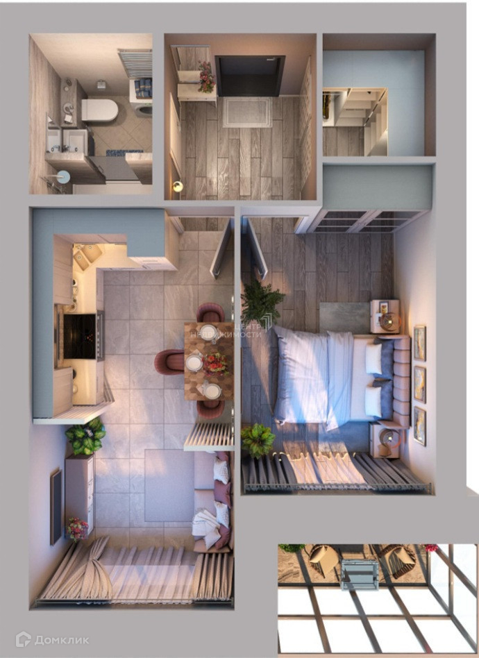 Просторная кухня- гостиная 15,6 м², вторая комната с панорамным окном и выходом на балкон, с нишей под шкаф-купе, функциональный холл правильной формы 4,8 м²+ отдельная гардеробная 2,8 м².