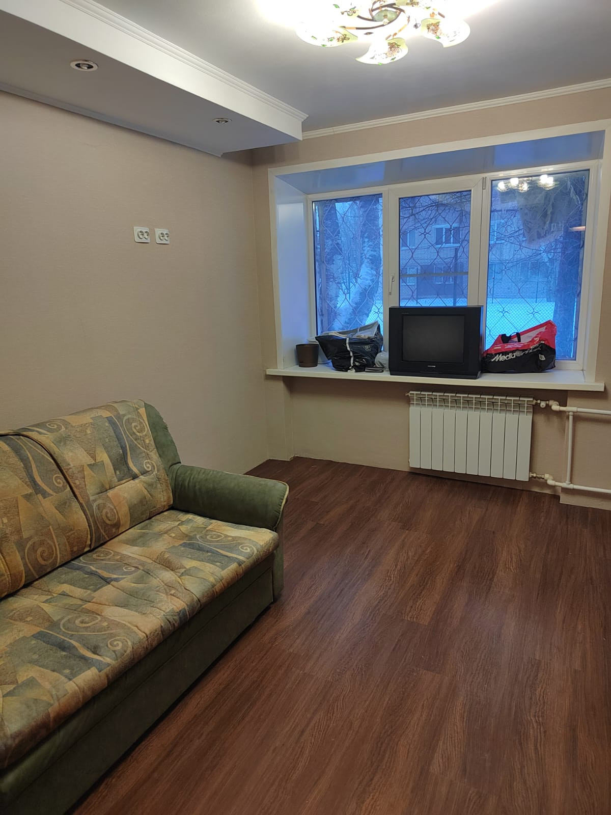Новые радиаторы отопления, хорошее окно, на полу ламинат +кафель.