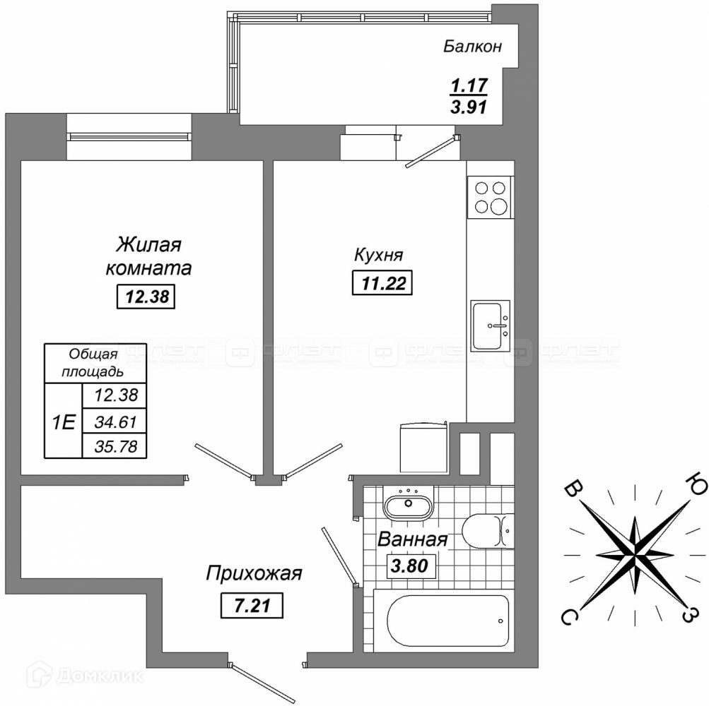 Общая площадь 38.2 м2