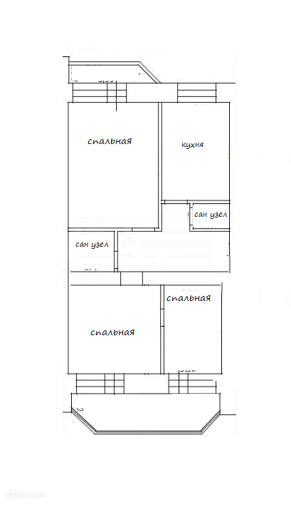 Планировка квартиры-распашонка, балконы на обе стороны дома 9,4 и 2,5 м2.