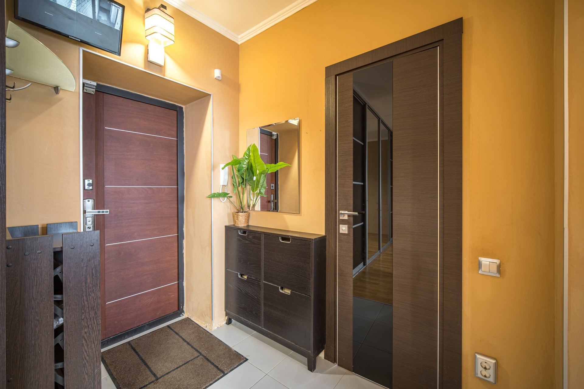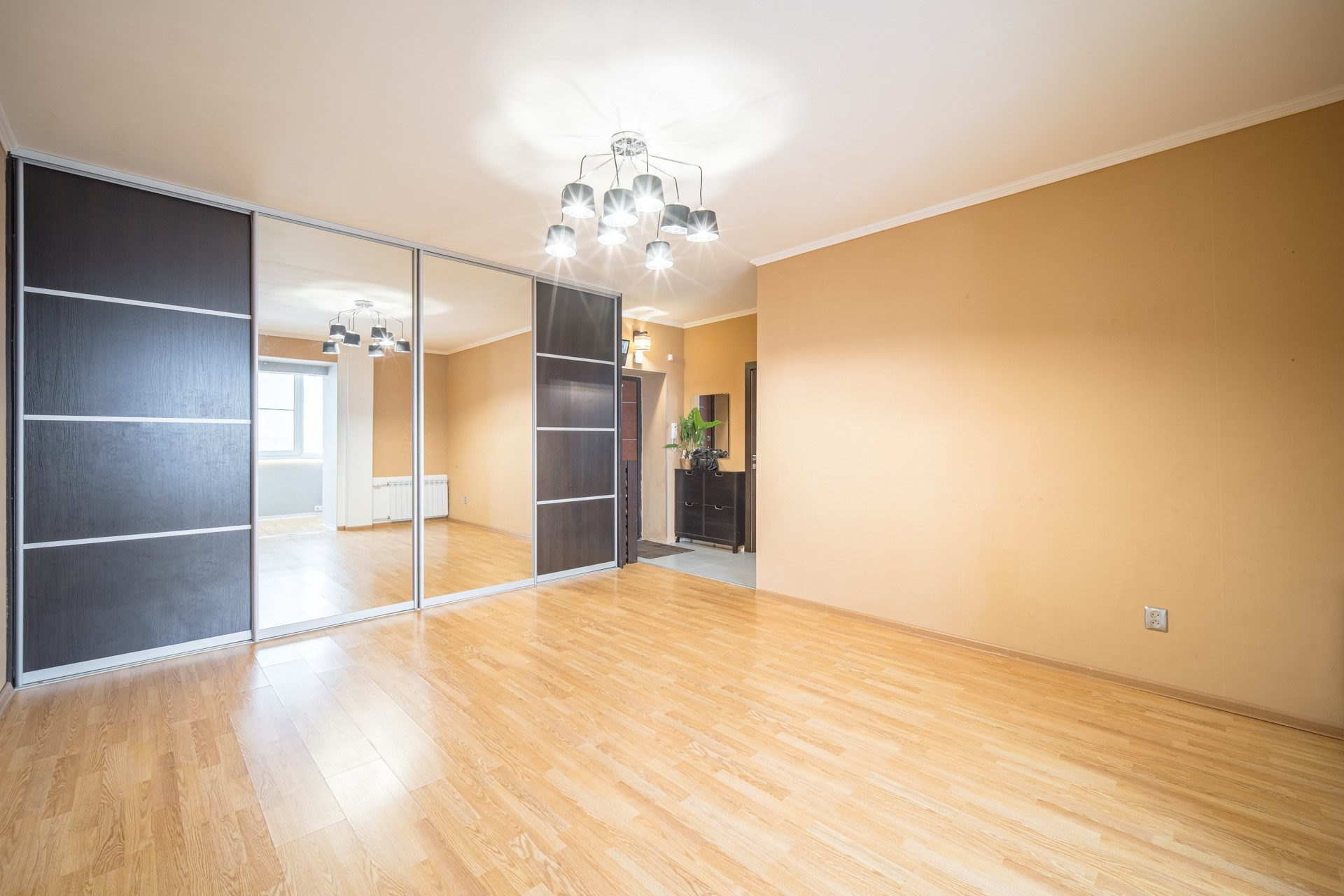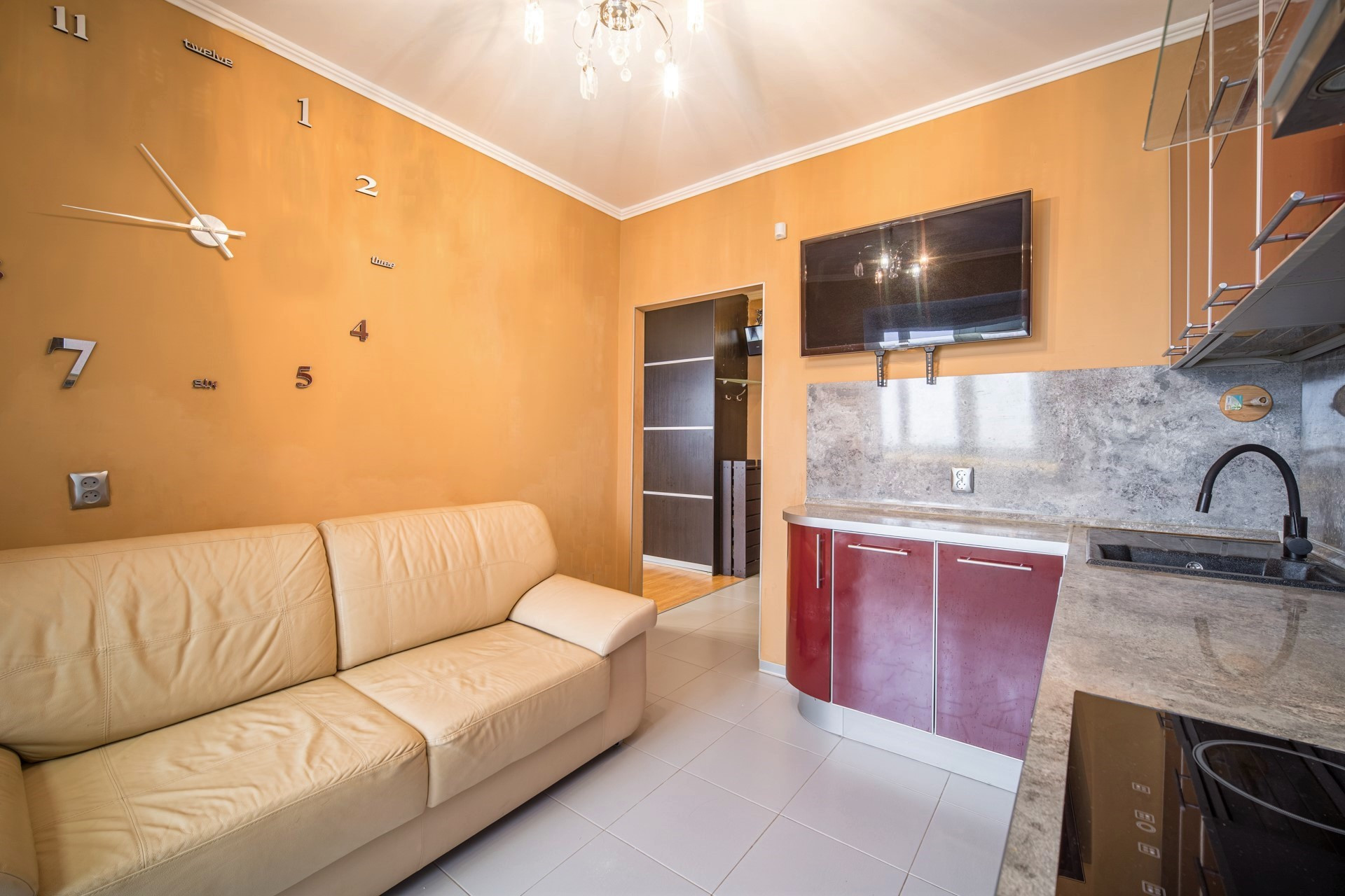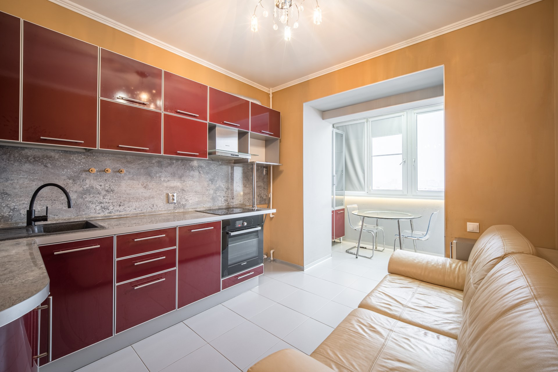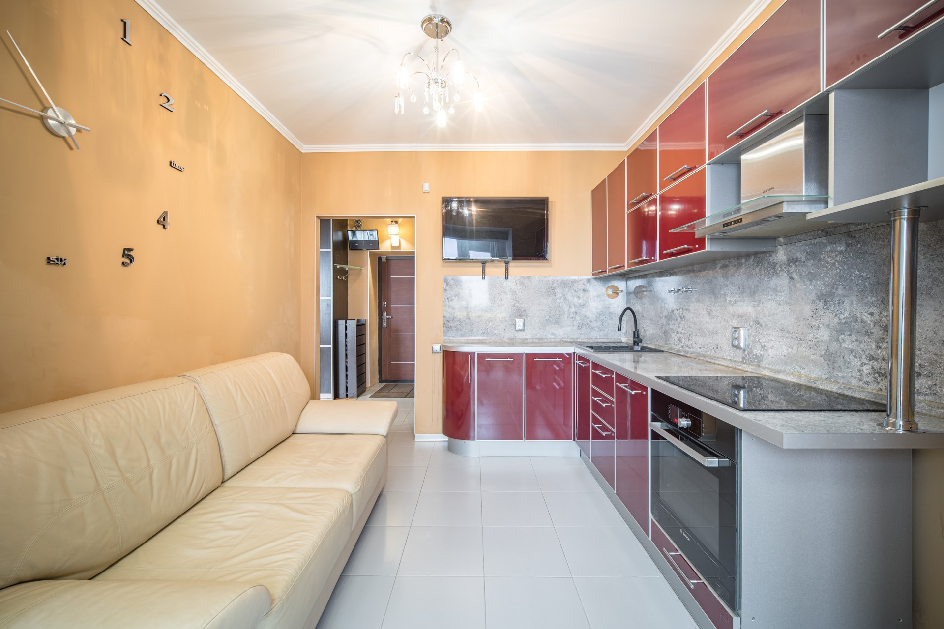 В квартире остаётся :  кухонный гарнитур с обеденной зоной, варочная панель и  духовой шкаф BOSCH ,  посудомоечная машина, диван, телевизор на кухне 40 дюймов (акустика с сабвуфером и караоке),  бойлер для нагрева воды, кондиционер,  вместительный шкаф-купе.