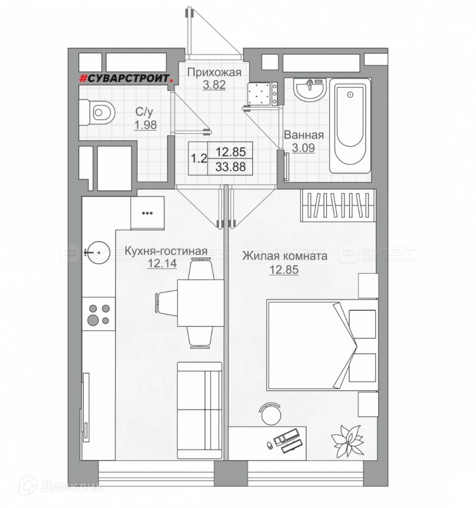 совмещенный санузел - 3,14 м2,