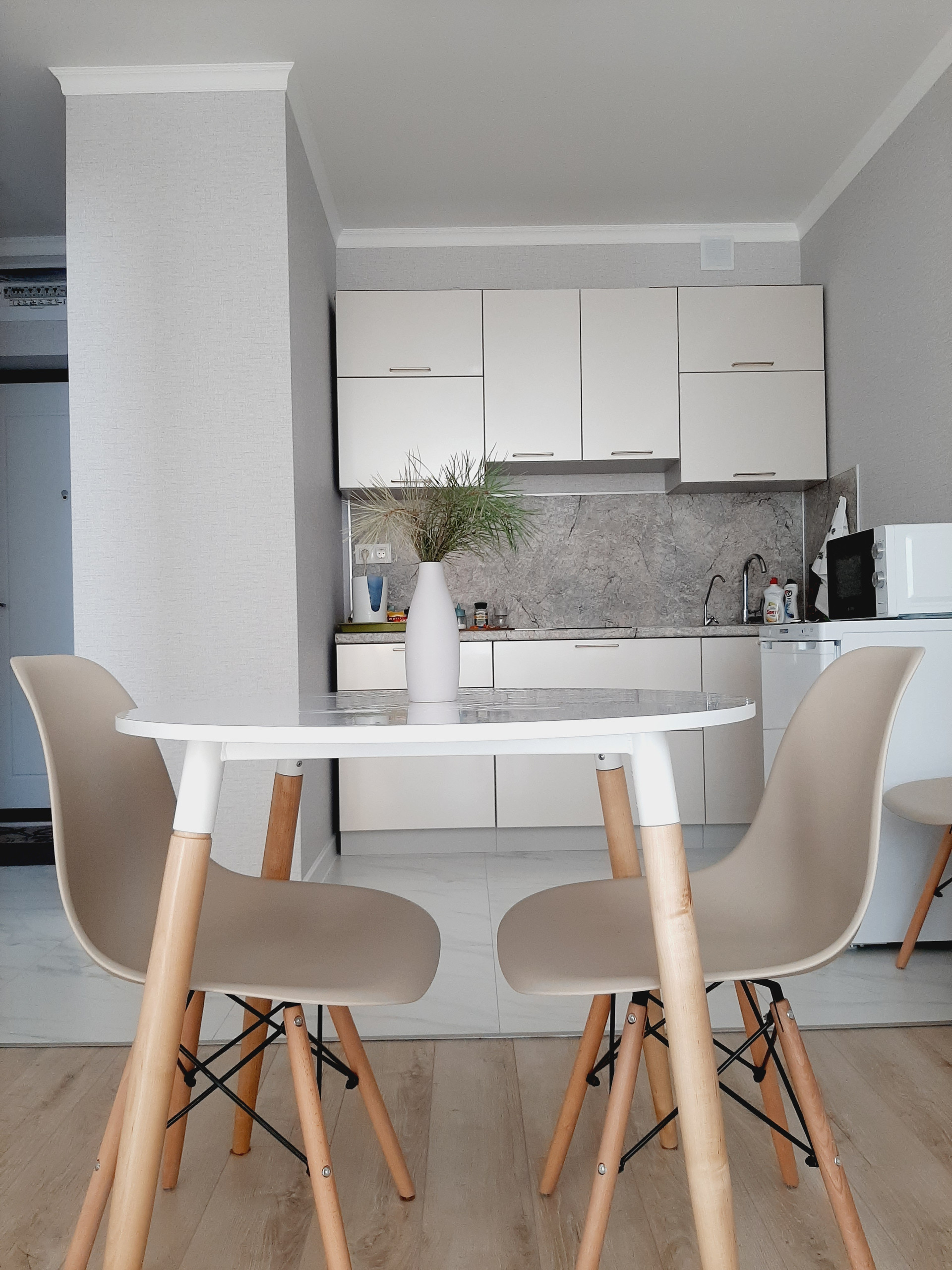 Кухонный гарнитур из эмали , индукционная варочная поверхность, чтстая фильтрованная вода от застройщика из крана.