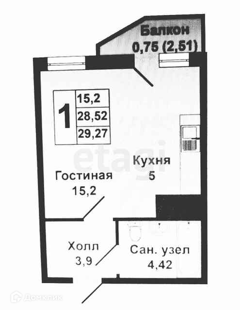 Общая площадь 28.5 м2