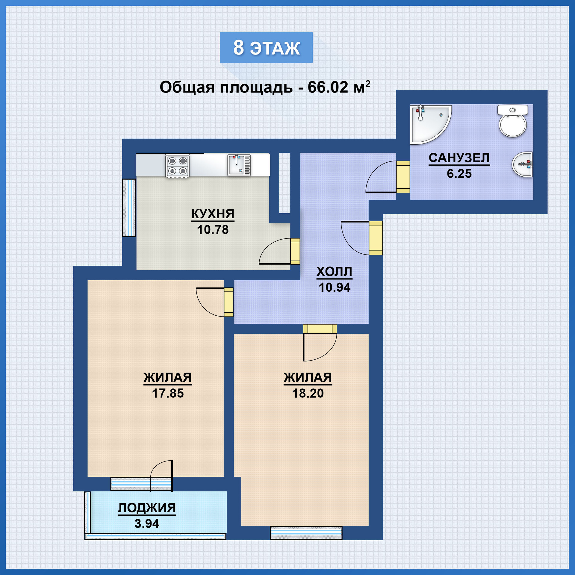 Уютная квартира общей площадью 66,02 кв.м. в которой выполнен качественный ремонт. Светлая кухня 10,78 кв.м. кухонный гарнитур, лоджия с панорамными окнами, просторные жилые комнаты 18,2 кв.м. и 17,85 кв.м., прихожая со встроенным шкафом-купе.