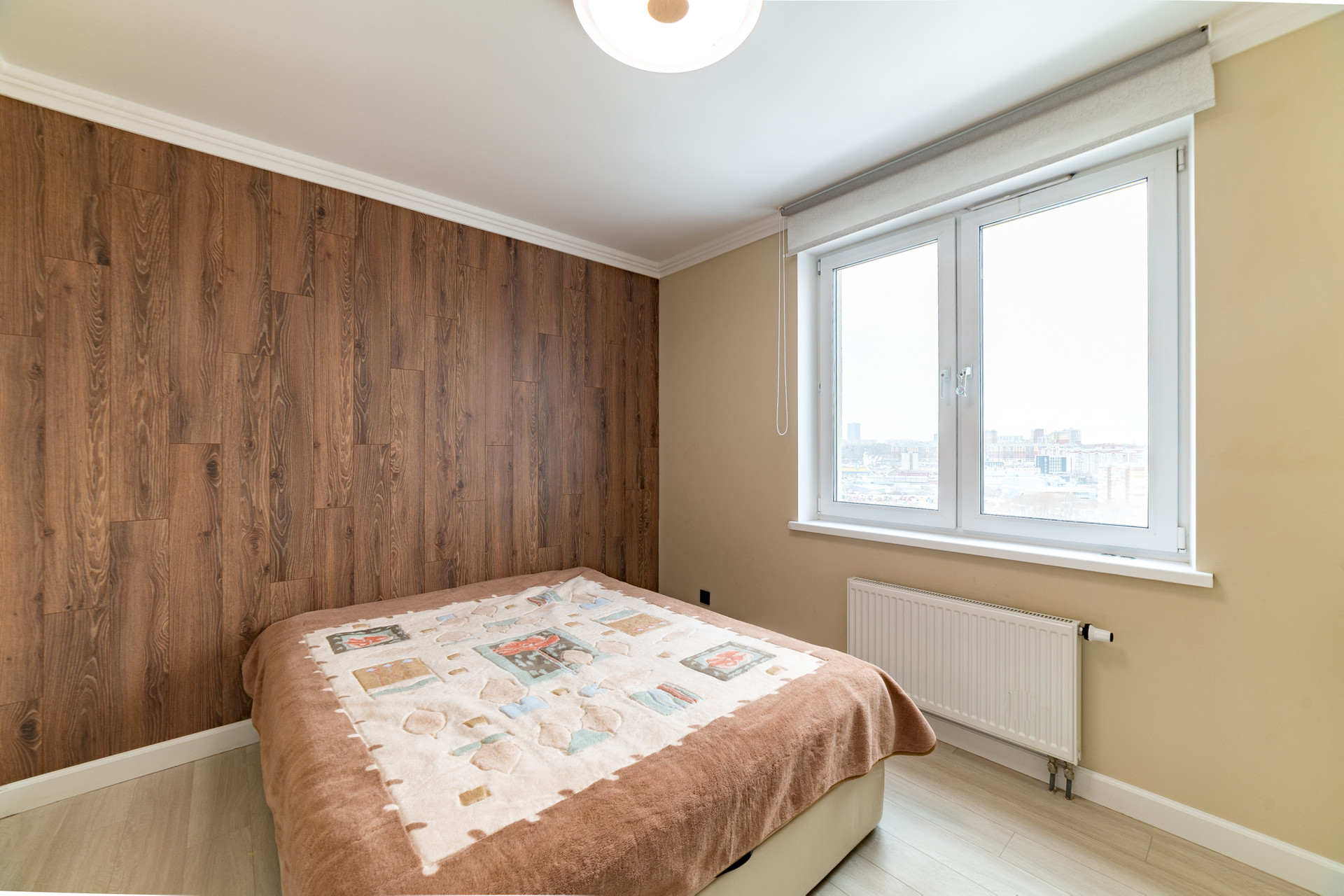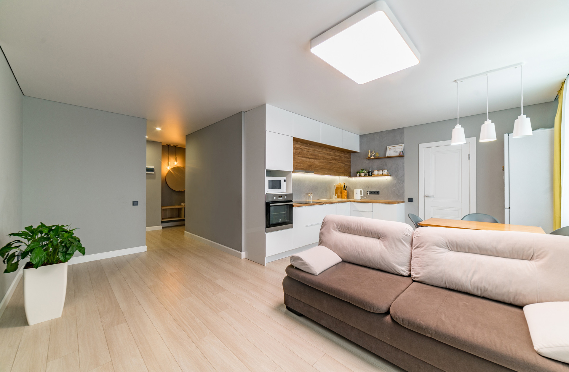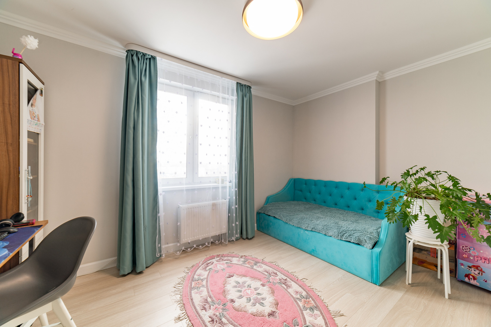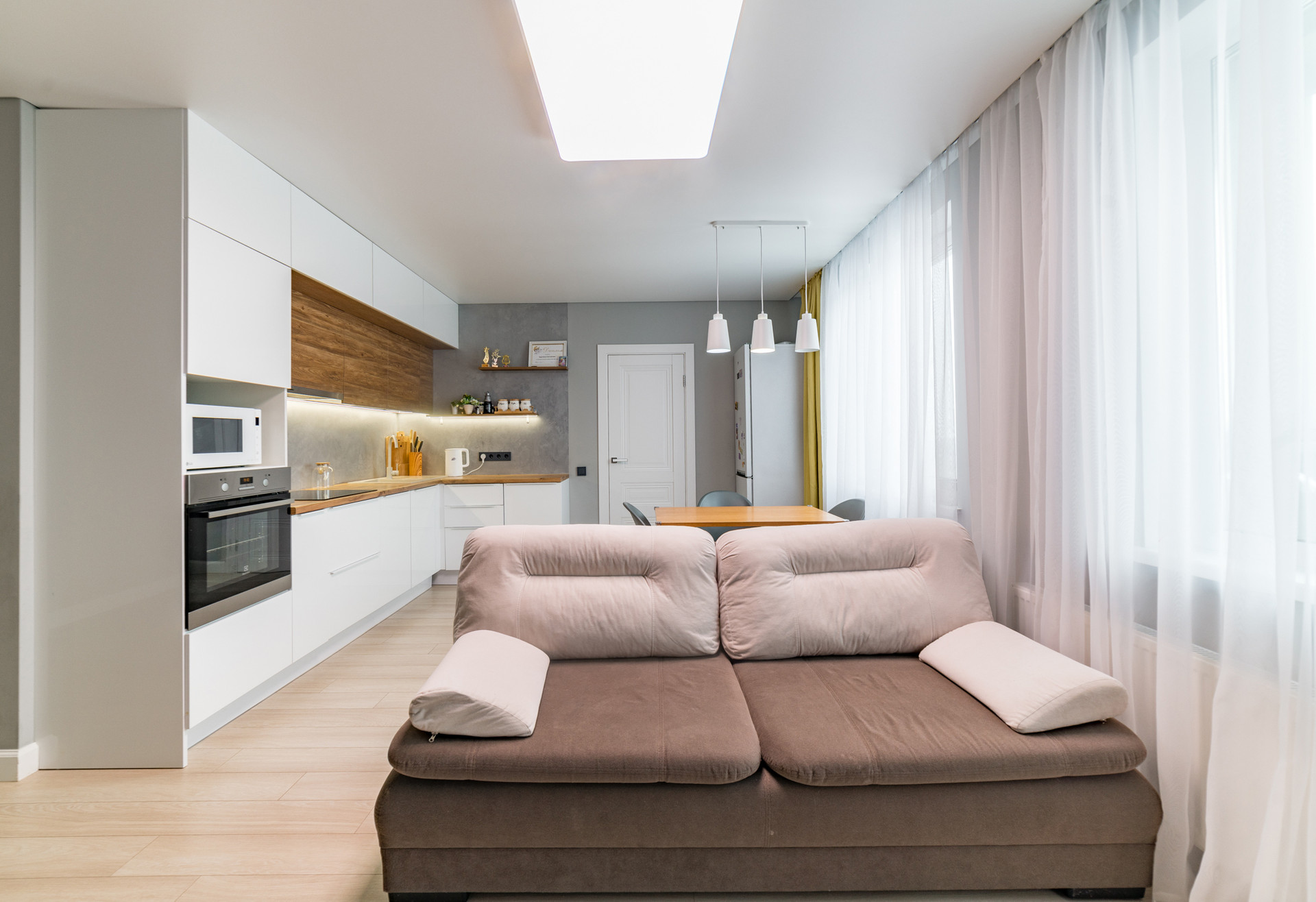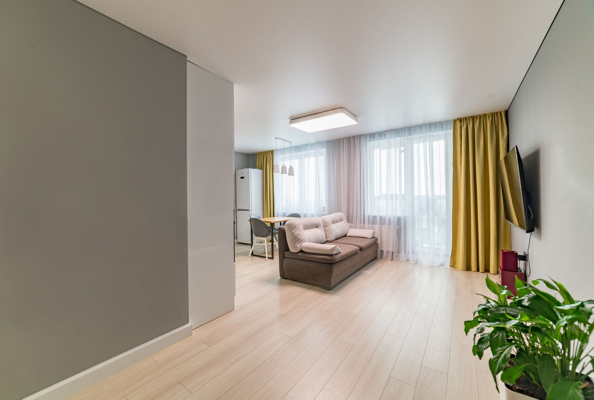 Квартира с комфортной планировкой - просторная кухня -гостиная с витражным остеклением и выходом на балкон, уютная спальная и детская комнаты, санузел совмещенный, холл, гардеробная.