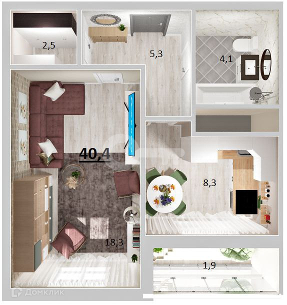 Общая площадь 37.7 м2 (+ большая застекленная лоджия), жилая 18.3 м2, кухня 8.5 м2, совмещенный санузел, прихожая 5.4 м2, гардеробная.