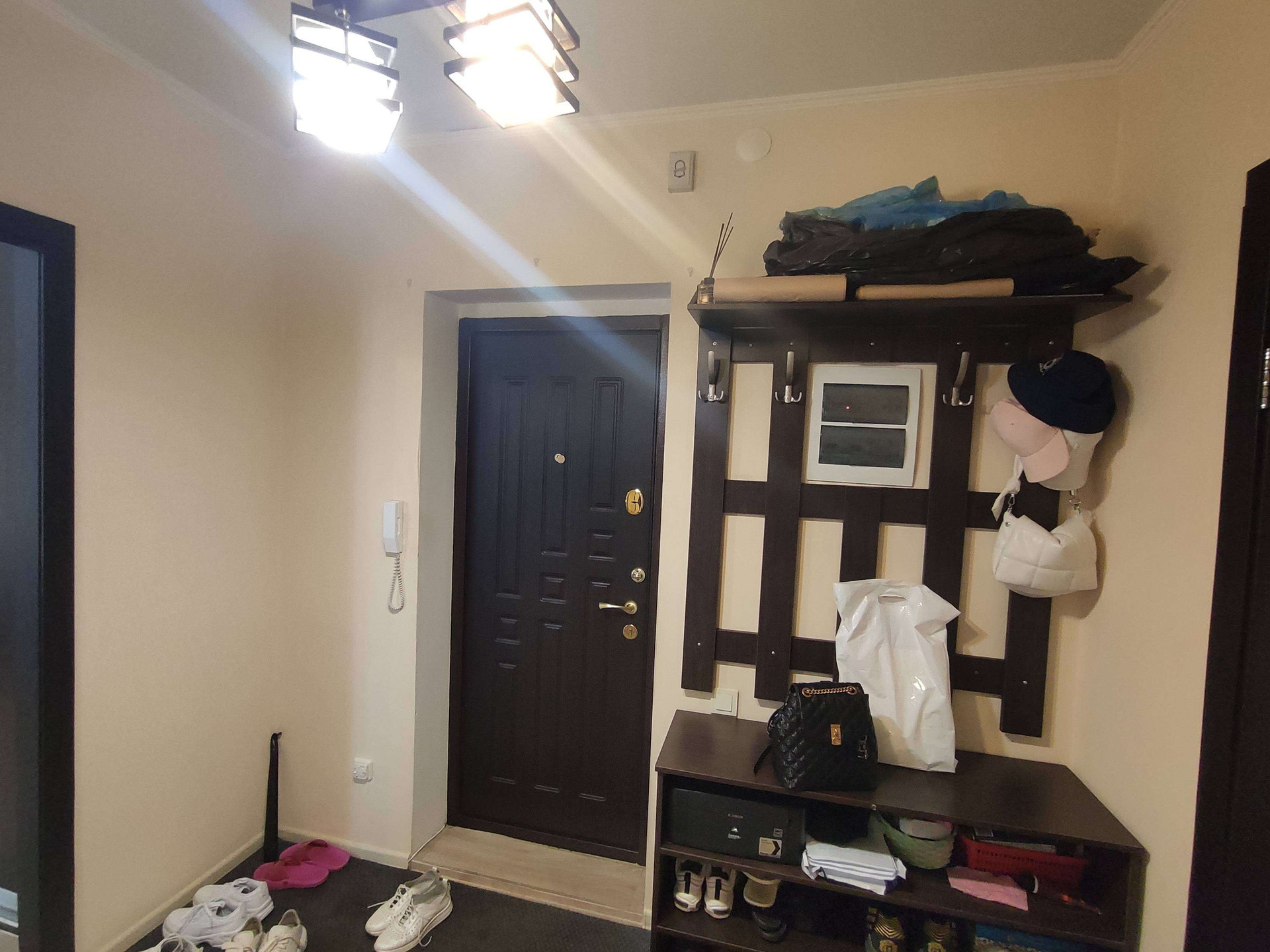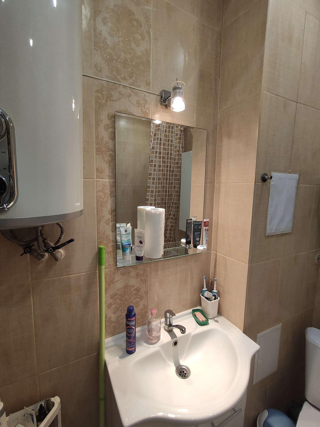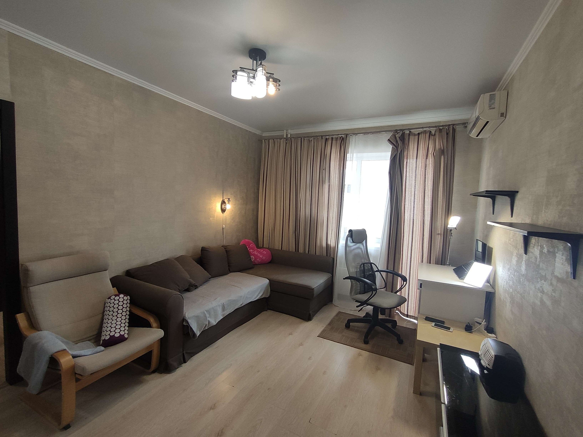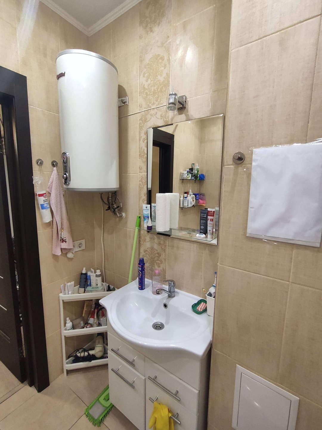 В квартире остаются: кондиционер, встроенный шкаф-купе, диван, кухонный гарнитур с встроенной техникой ( духовка, варочная панель, посудомоечная машина, вытяжка, есть место под стиральную машину), водонагреватель, шкафчик в ванной, прихожая.