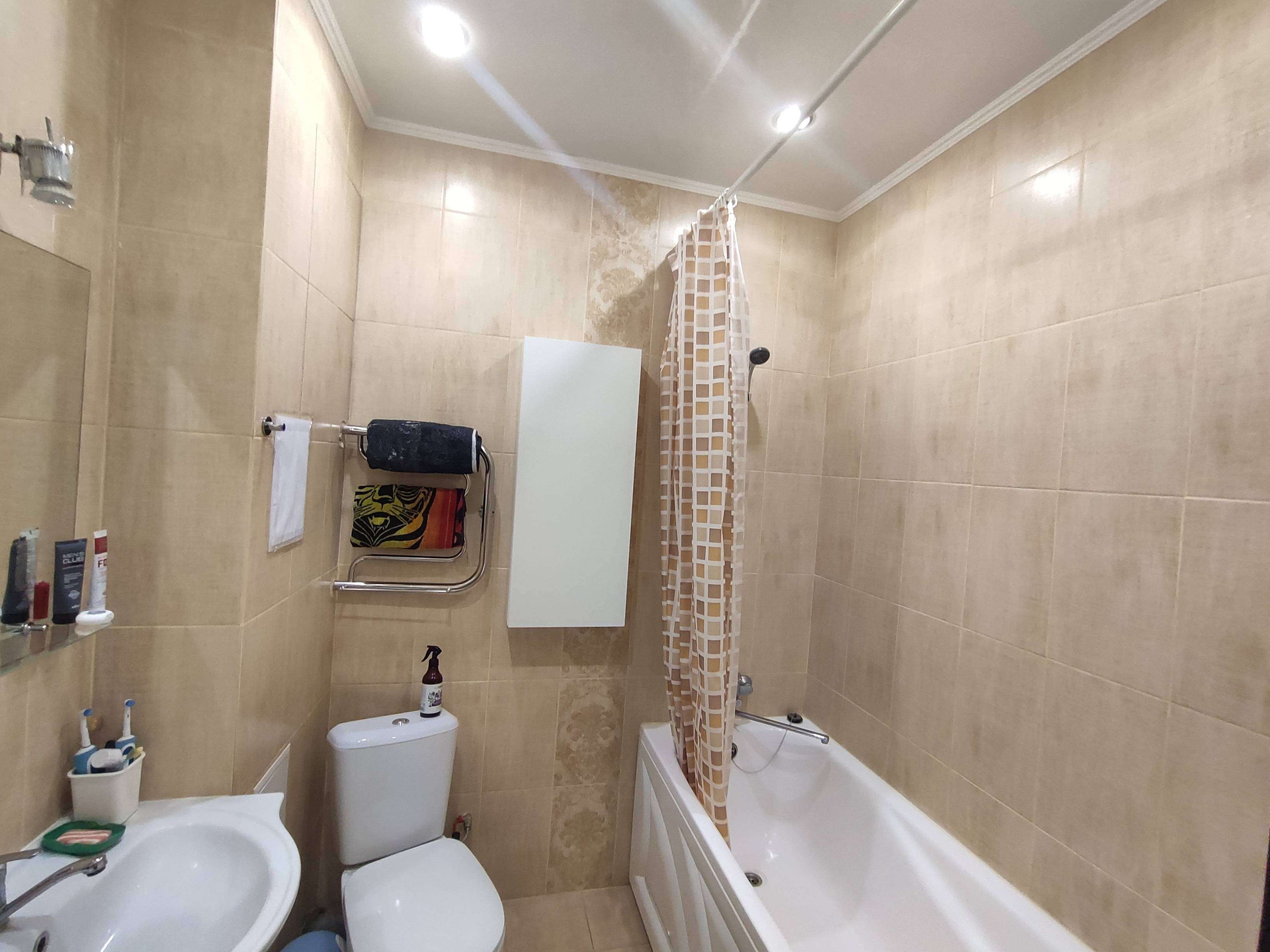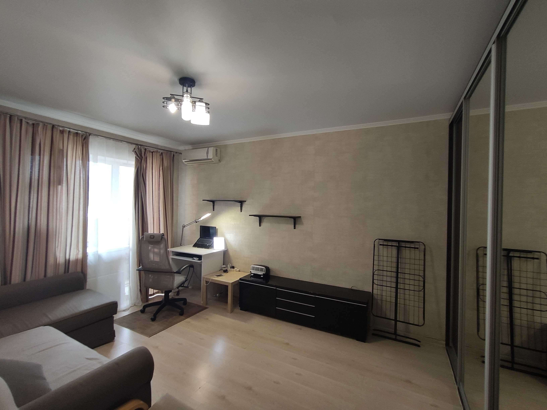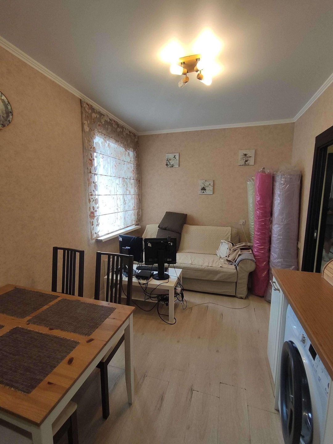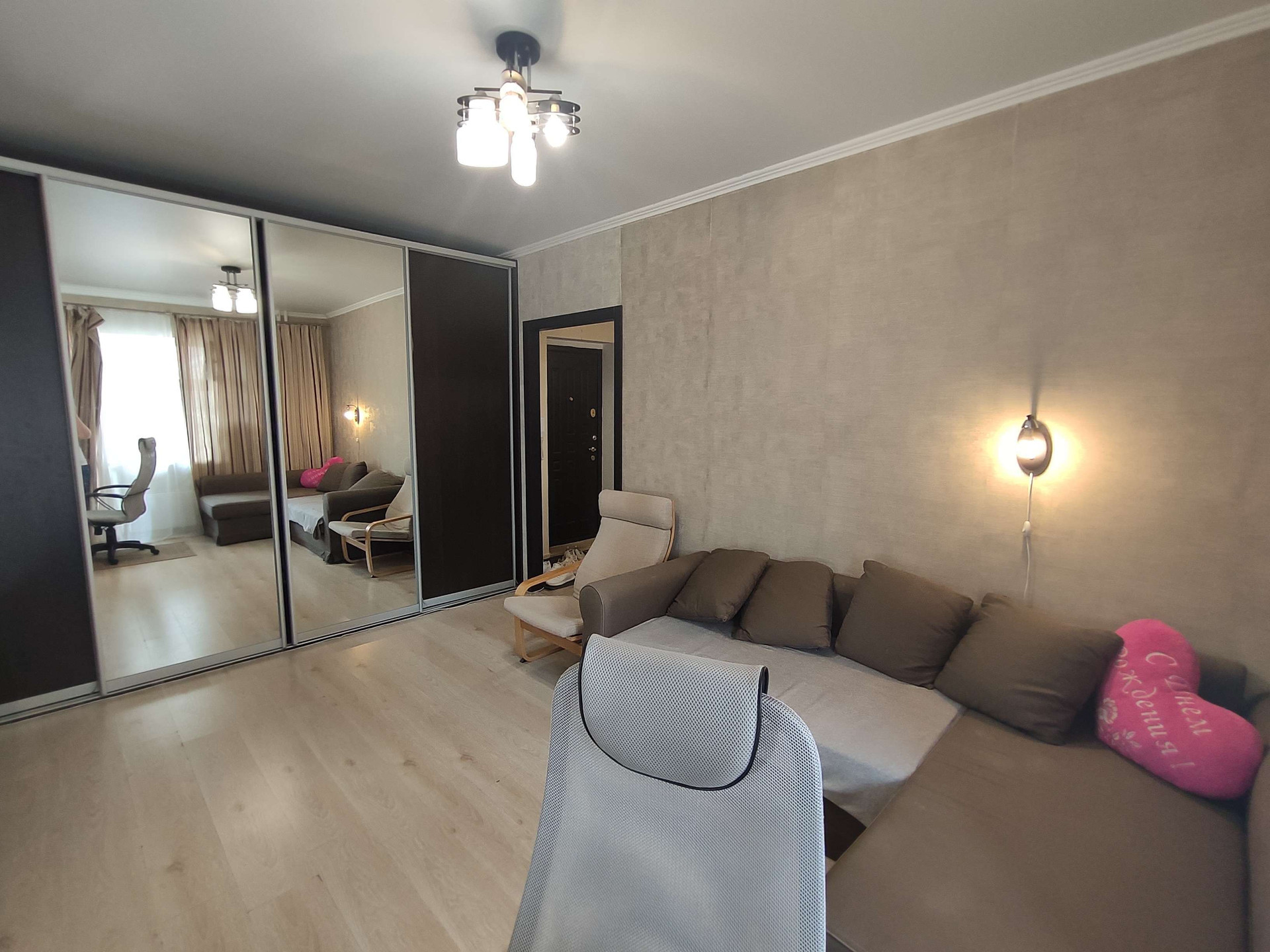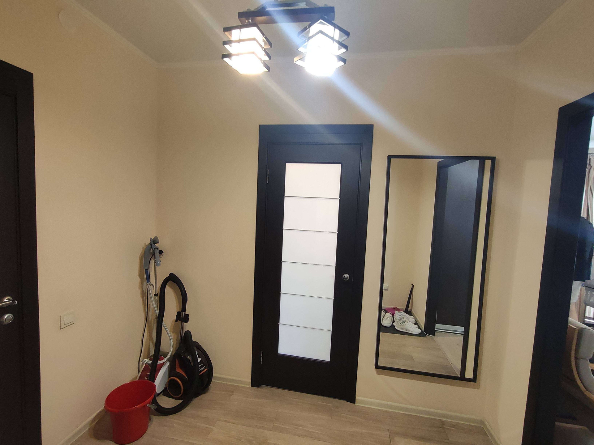 В квартире сделан качественный ремонт: натяжные потолки , пластиковые окна, полы ламинат, в коридоре кафель с теплым полом. Санузел совмещён в современном кафеле, хорошая входная и межкомнатные двери, спокойные обои.