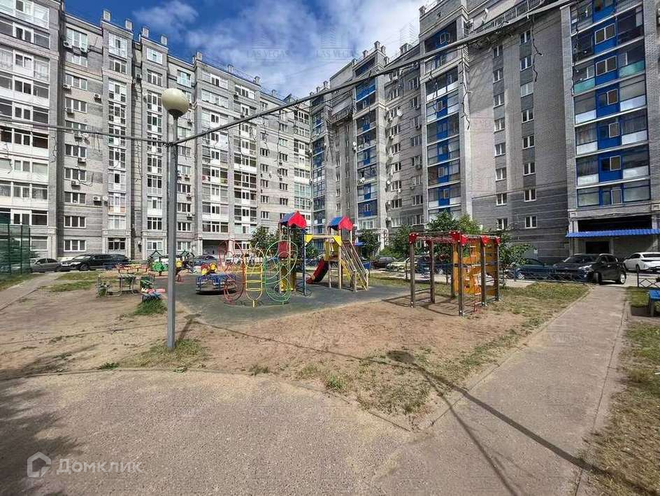 Большой двор с детской площадкой и футбольным полем с газоном.