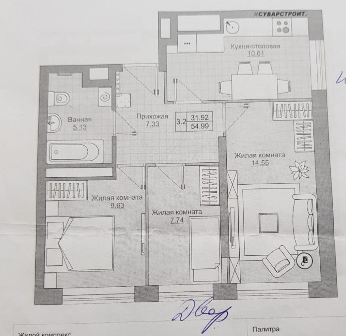 Продам компактную 3-х ком в ЖК Палитра. 22/25 Дом Сдан! Предчистовая отделка. Площадь 55кв. Жилая 14,55/9,63/7,74кв.м. кухня 11кв.м