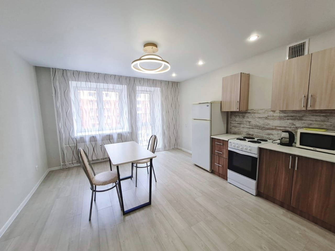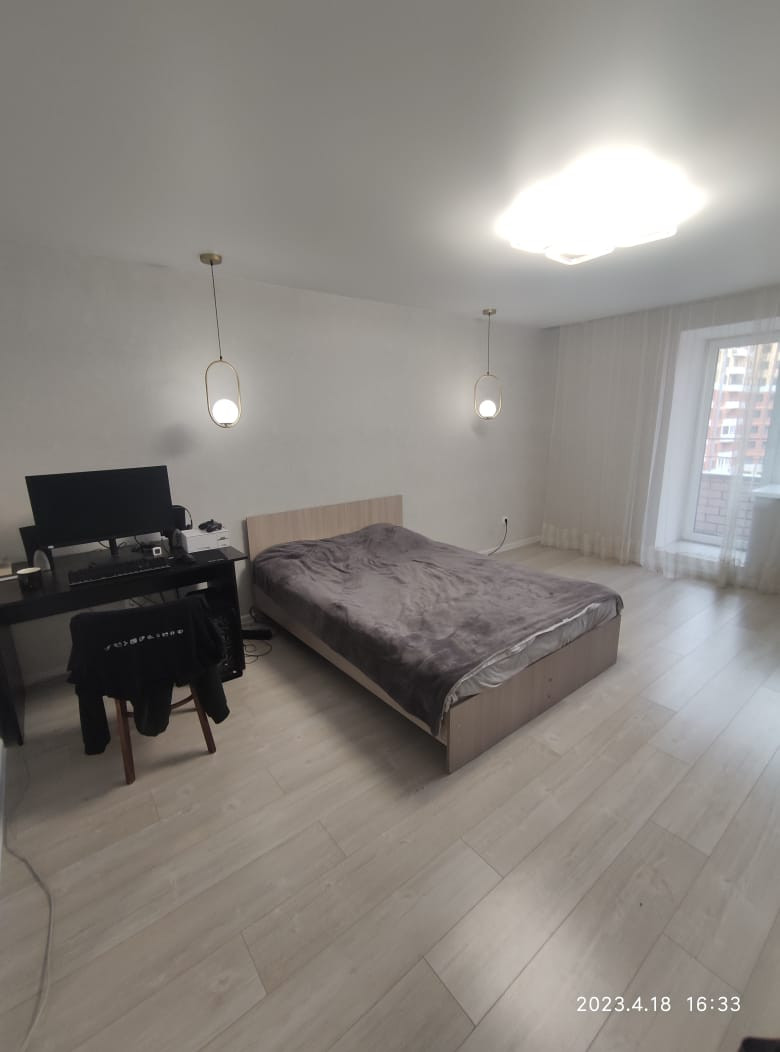 Сделан дизайнерский ремонт. Использовались материалы высокого качества: дорогой керамогранит, ламинат 33 класса, стены и полы выровнены, натяжные потолки, окна тройной стеклопакет с функцией микропроветривания. Расширенные оконные проемы,за счёт их много естественного света.