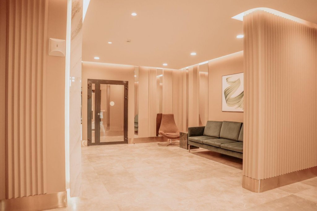 Первый этаж оснащен паркингом, различными видами инфраструктуры и входными группами с круглосуточным видеонаблюдением. Плюс: ресепшн, консьерж, зона хранения и помывки колясок и велосипедов, туалет, зона ожидания для гостей с мягкими диванами, камином и телевизором.