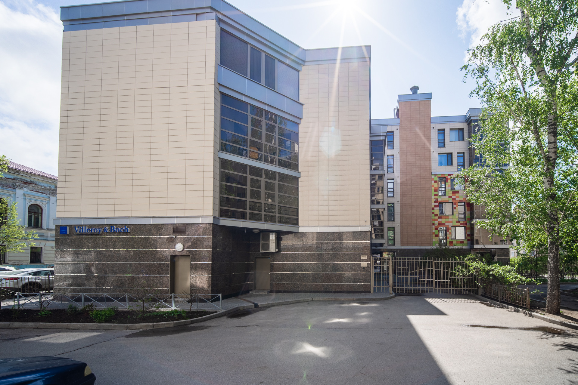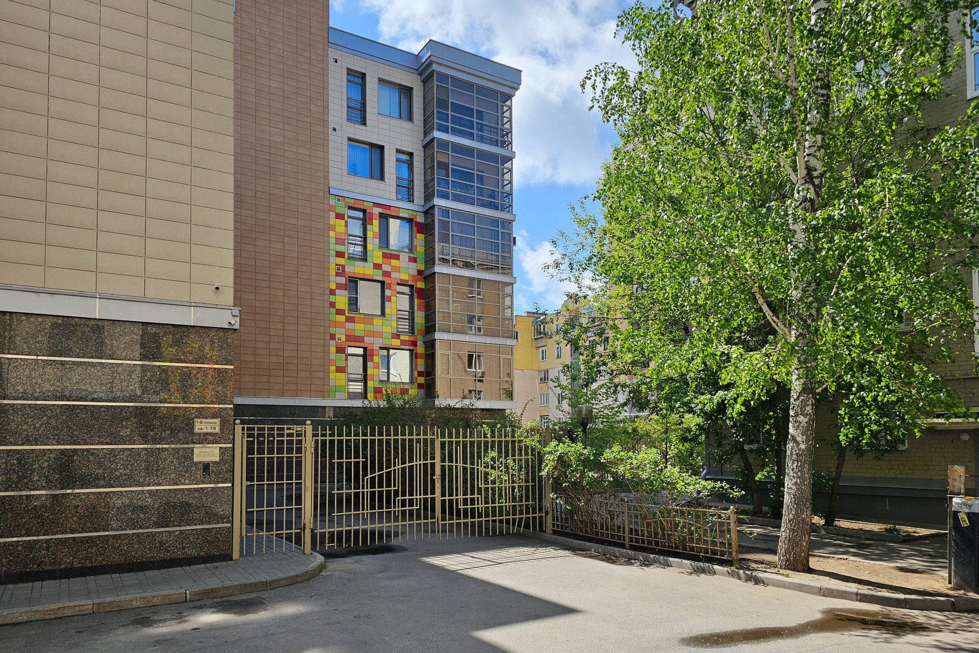 Двор огорожен, территория охраняется, есть подземная парковка.