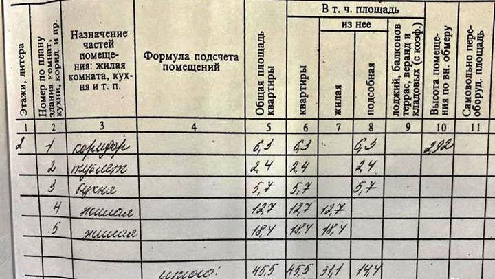 Общая площадь 45.5 м2, жилая 31.10 м2, кухня 5.7 м2. Высота потолков 2.92 м.