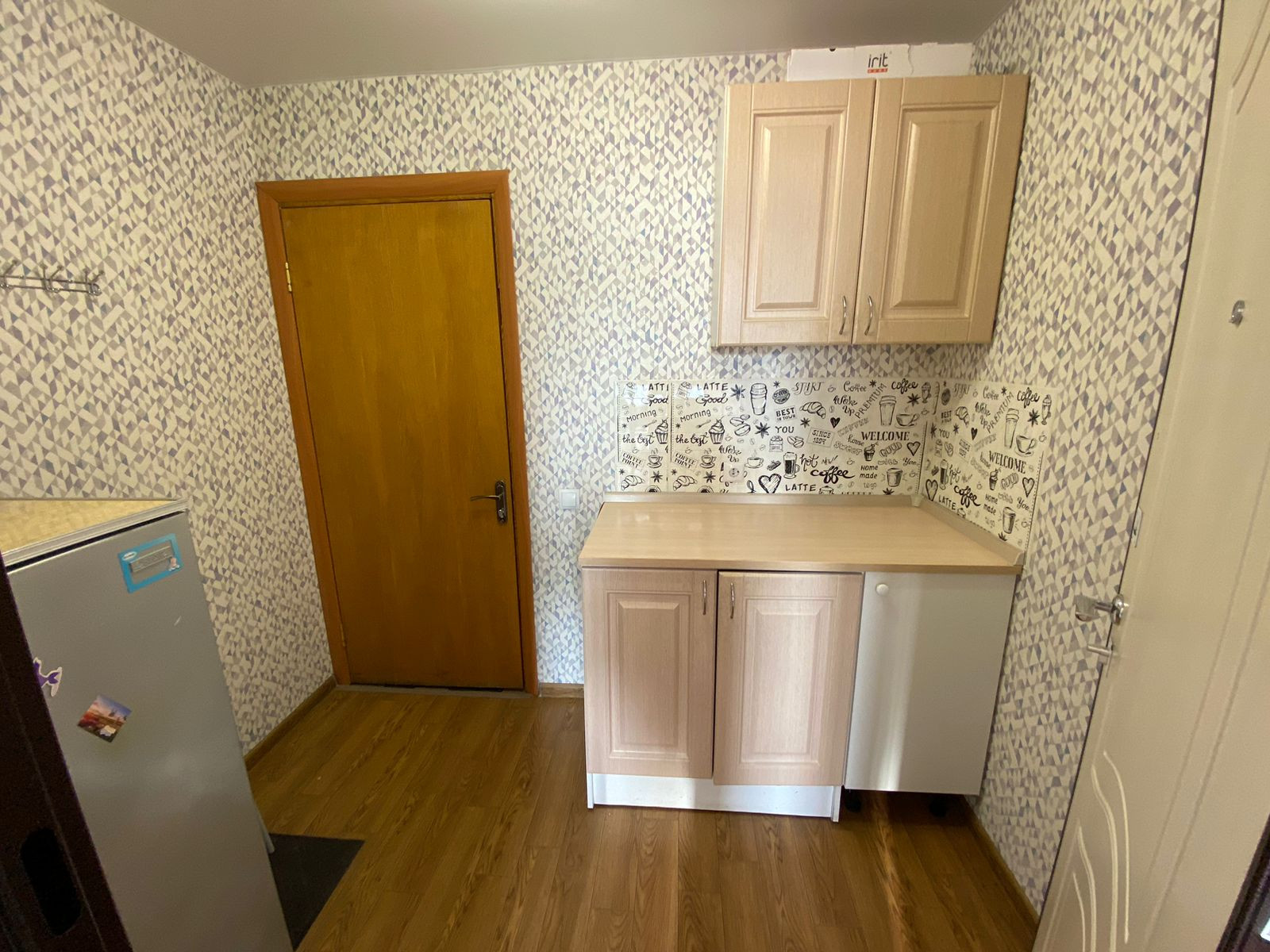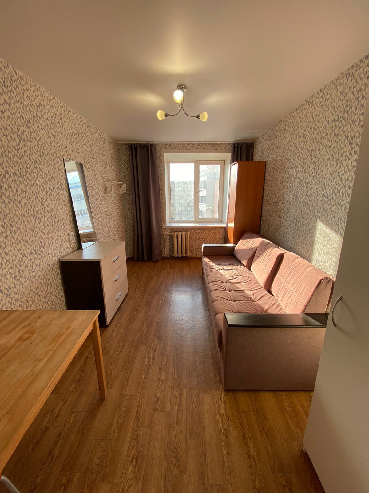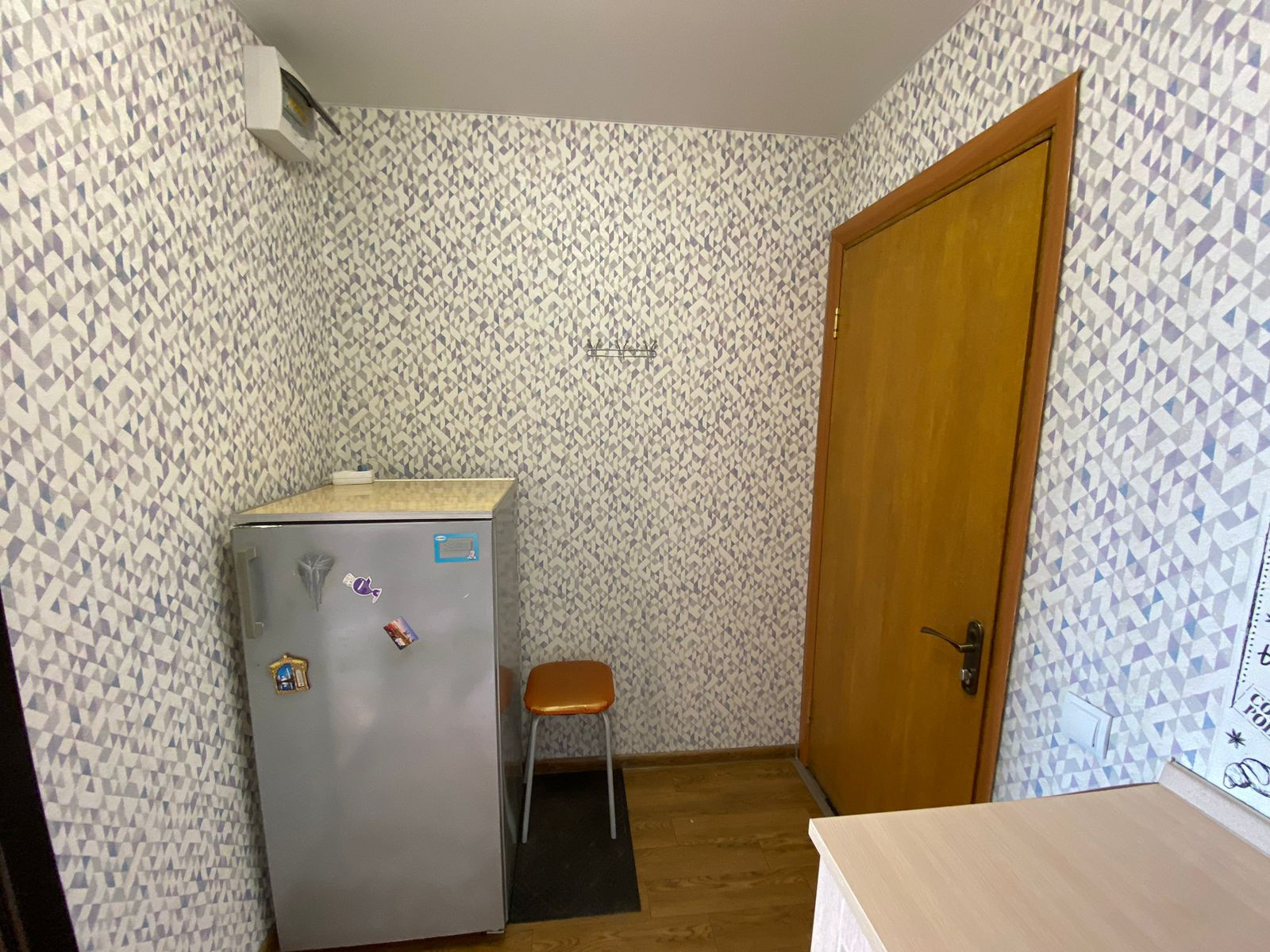 с хорошим ремонтом, проводка поменяна. Остаётся всё: диван, сушилка, чайник, шкаф, кухня, холодильник, плитка электрическая. Кроме стола, табуретов и стиральной машины.