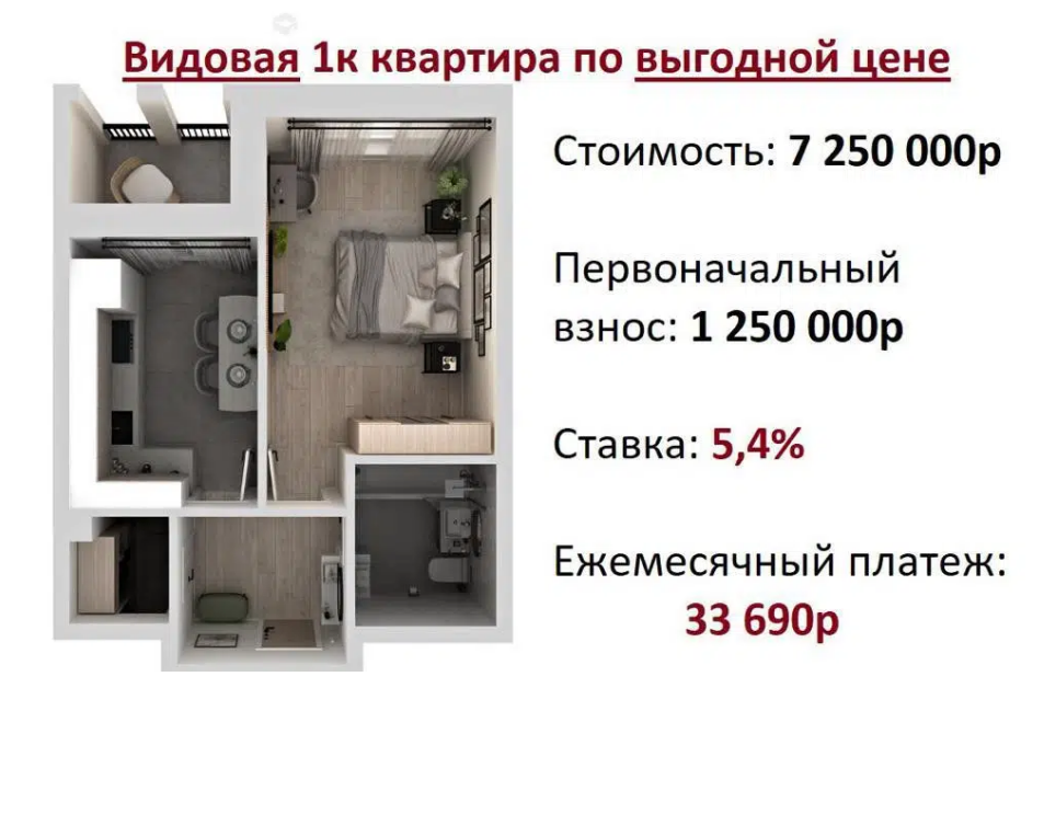 Общая ПЛОЩАДЬ квартиры: 33,6 м².