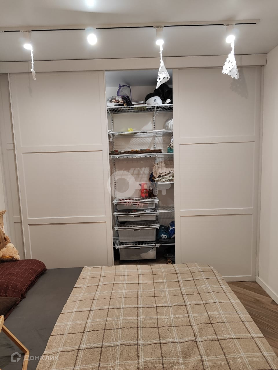 Кухонный гарнитур остается новым хозяевам с частью встраиваемой техники. В комнате вместительный встроенный гардероб.