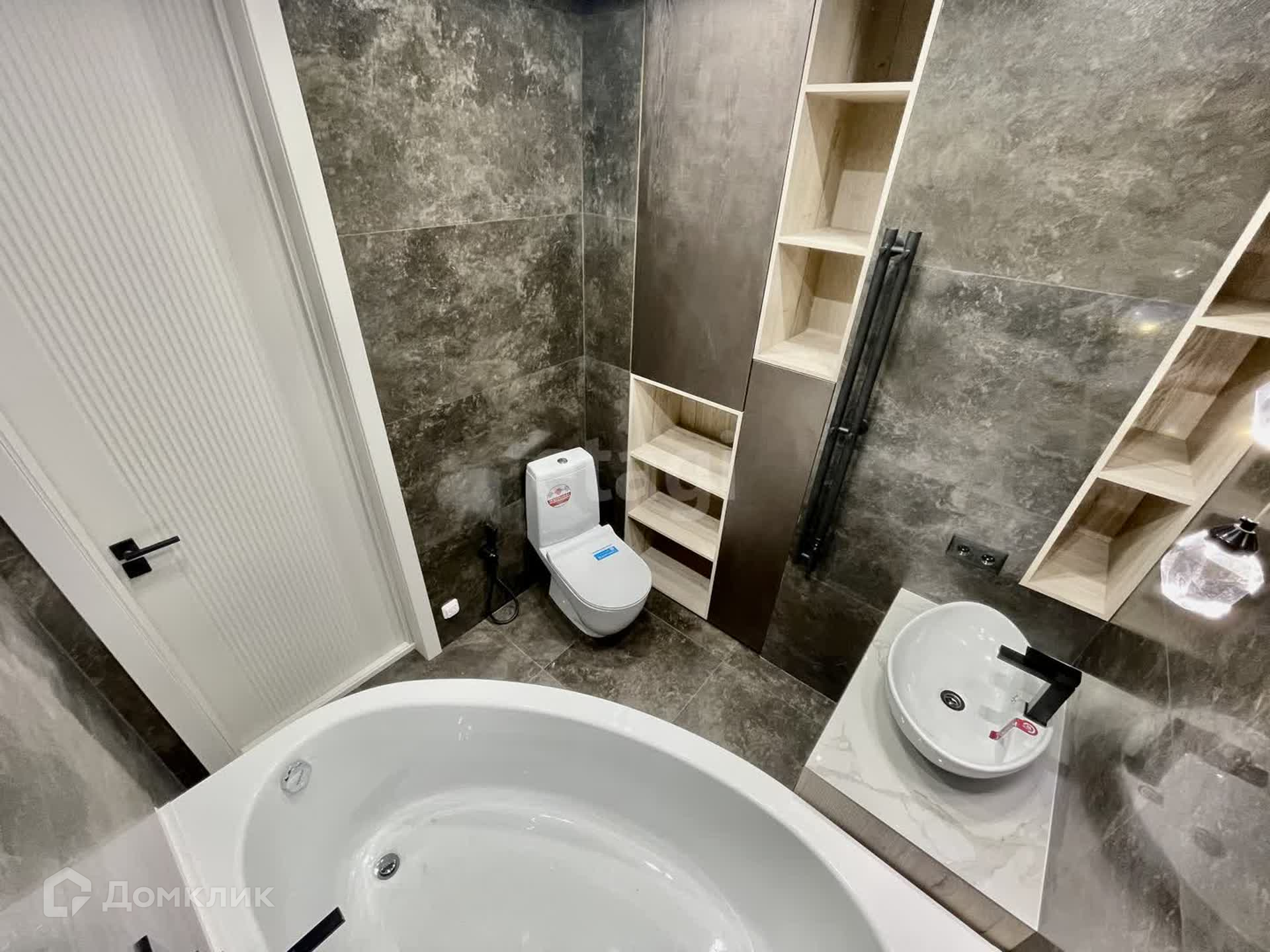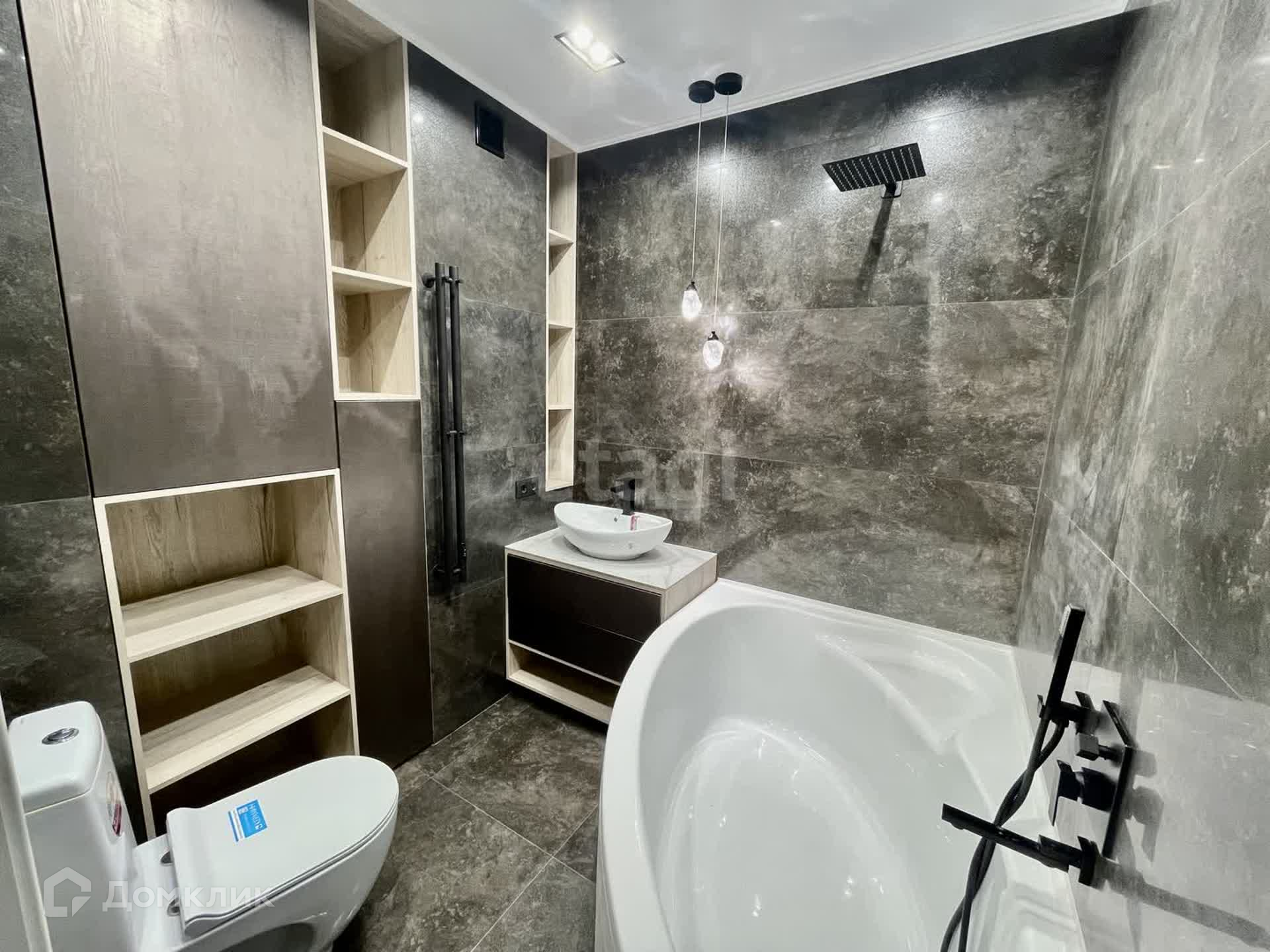 - совмещённый санузел 4,5 кв.м. с угловой ванной, дизайнерским умывальником и инсталяцией с гигиеническим душем, в нише установлен водонагреватель и полки;
