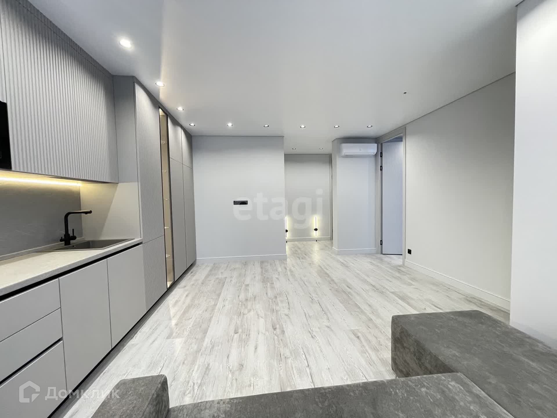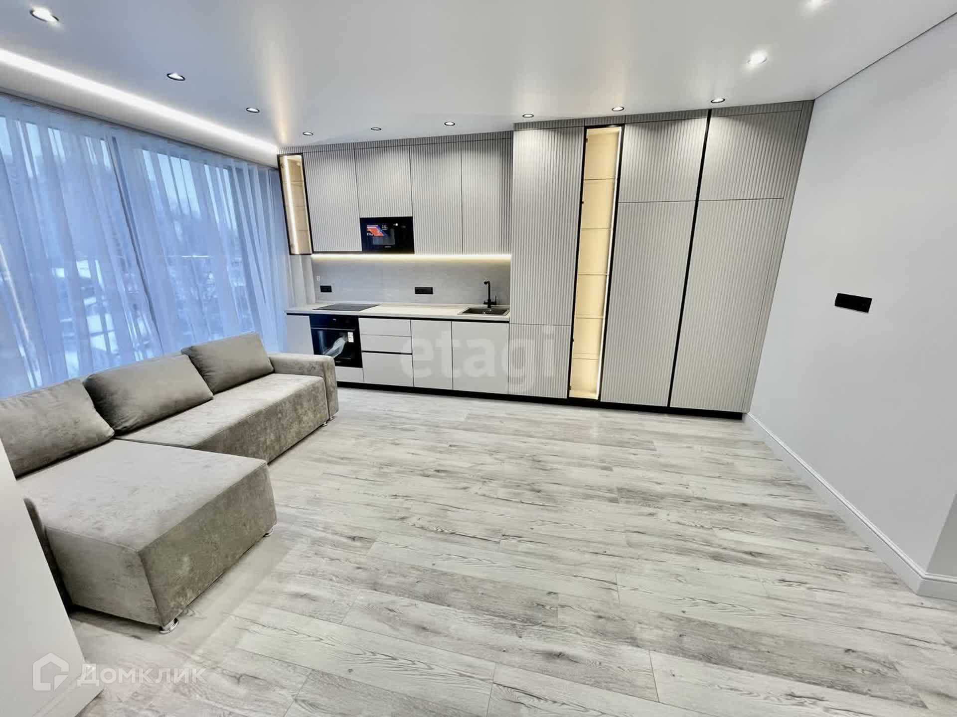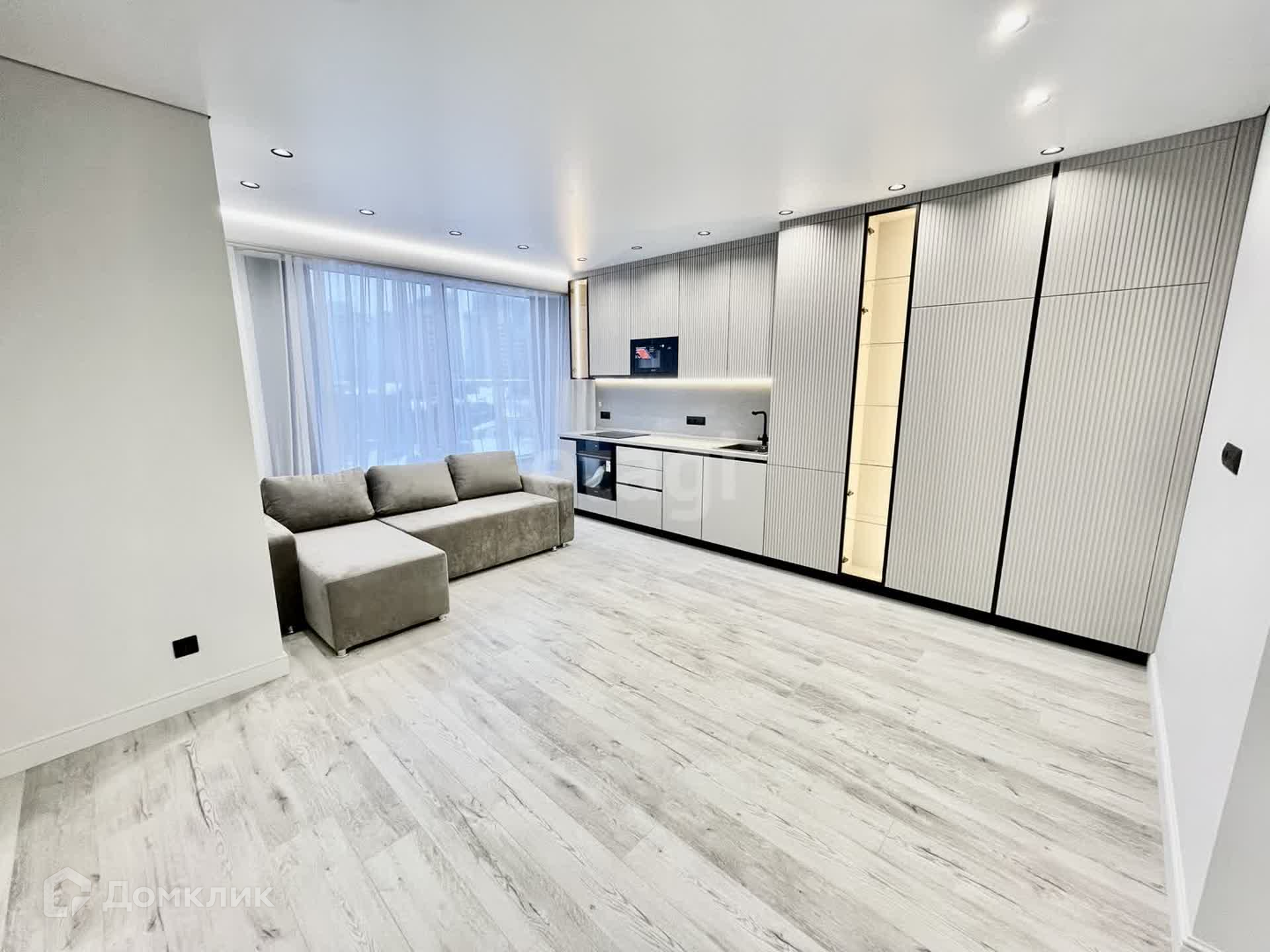 - кухня-гостиная 16 кв.м. с кондиционером и панорамным остеклением, с кухонной и гостиной зоной с удобным диваном. Новый кухонный гарнитур сделанный под заказ со встроенной техникой (холодильник, варочная панель, духовка, посудомойка, вытяжка) остается в подарок новым хозяевам.