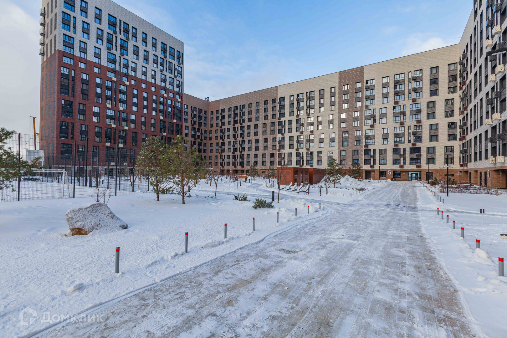Двор закрытый, детские и спортивные площадки, большое футбольное поле, лежаки, много зелени.